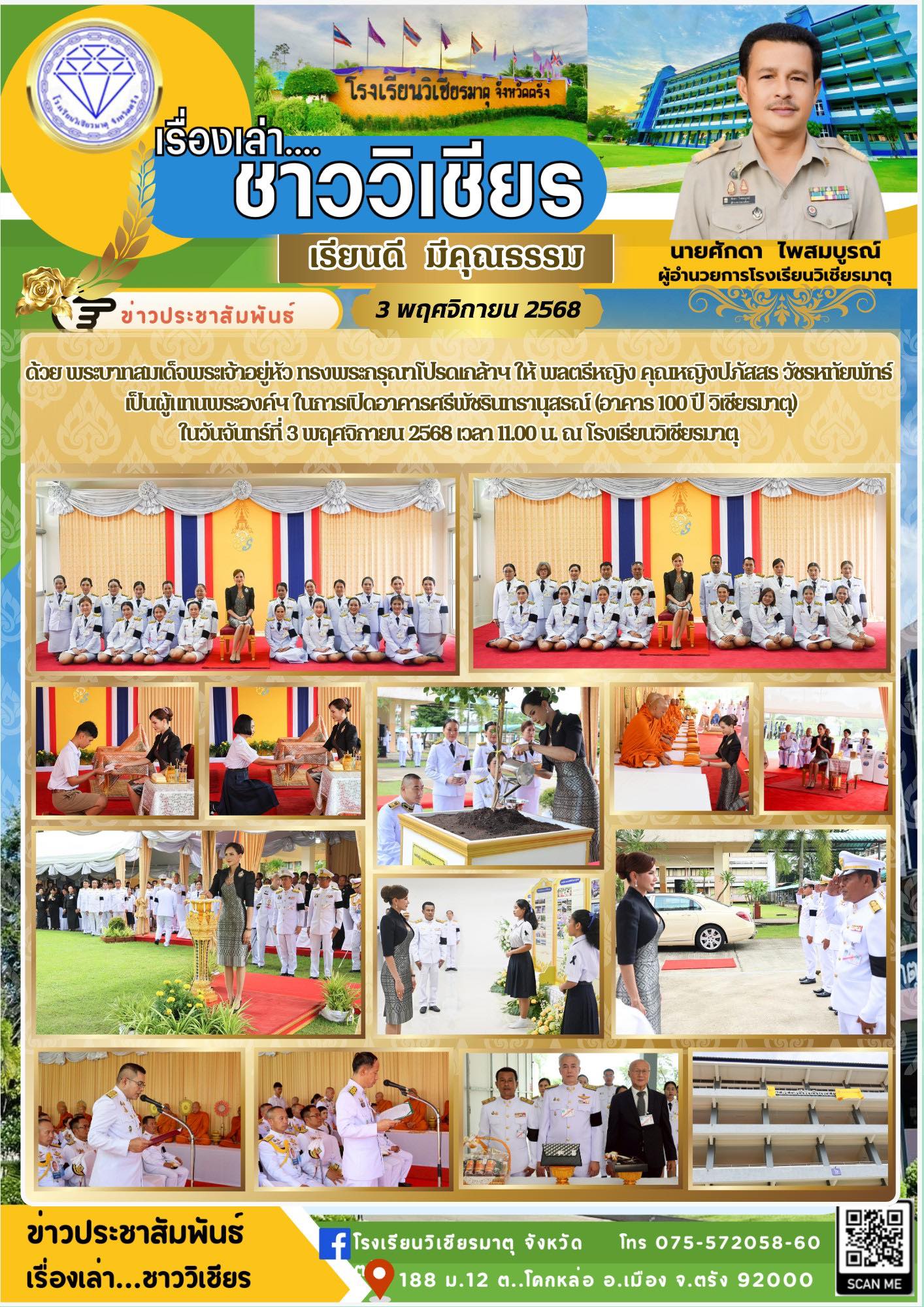 ด้วย พระบาทสมเด็จพระเจ้าอยู่หัว ทรงพระกรุณาโปรดเกล้าฯ ให้ พลตรีหญิง คุณหญิงปภัสสร วัชรหทัยพัทธ์ เป็นผู้แทนพระองค์ฯ ในการเปิดอาคารศรีพัชรินทรานุสรณ์ (อาคาร 100 ปี วิเชียรมาตุ) ในวันจันทร์ที่ 3 พฤศจิกายน 2568 เวลา 11.00 น. ณ โรงเรียนวิเชียรมาตุ