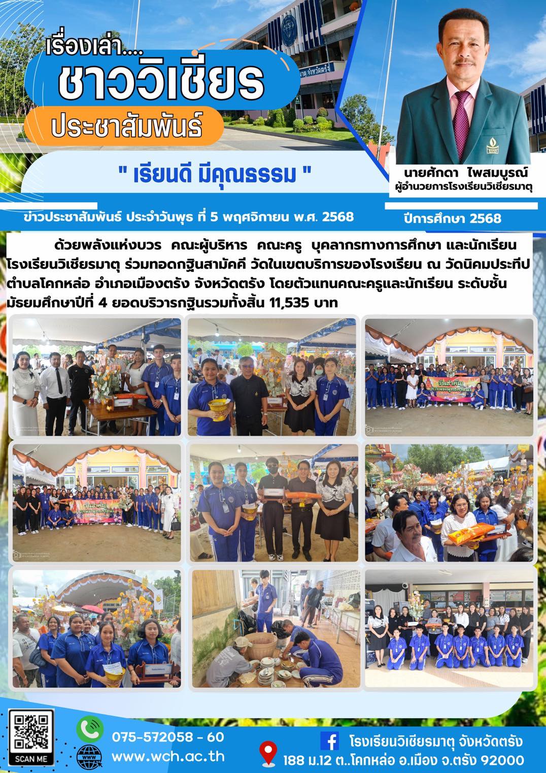ด้วยพลังแห่งบวร คณะผู้บริหาร คณะครู บุคลากรทางการศึกษา และนักเรียนโรงเรียนวิเชียรมาตุ ร่วมทอดกฐินสามัคคี วัดในเขตบริการของโรงเรียน ณ วัดนิคมประทีป ตำบลโคกหล่อ อำเภอเมืองตรัง จังหวัดตรัง โดยตัวแทนคณะครูและนักเรียน ระดับชั้นมัธยมศึกษาปีที่ 4 ยอดบริวารกฐินรวมทั้งสิ้น 11,535 บาท