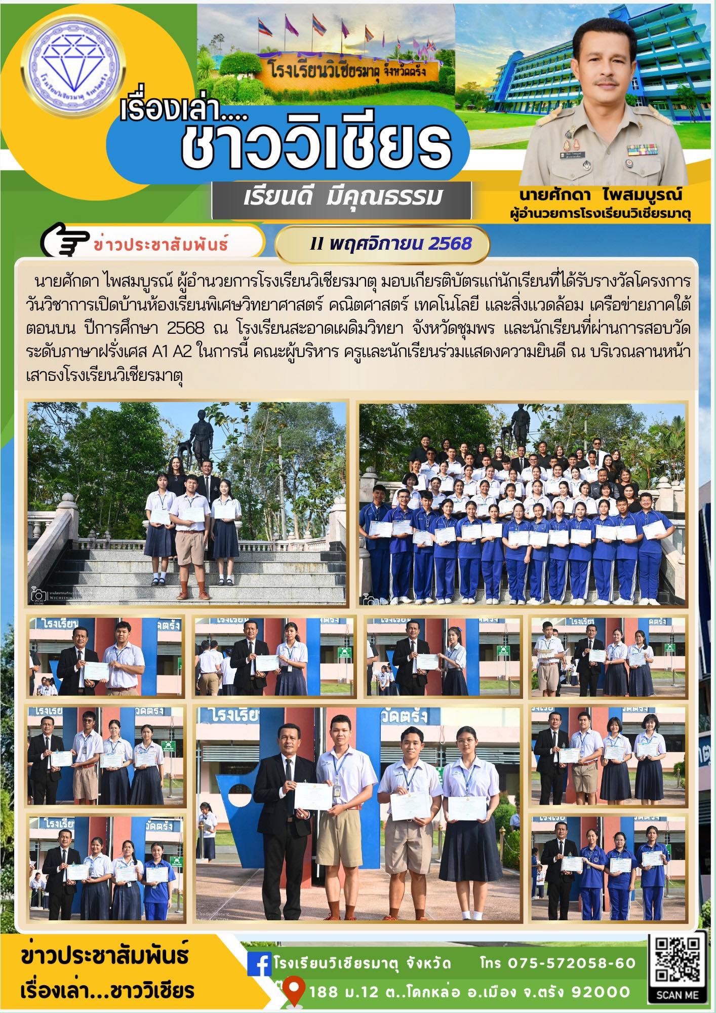 นายศักดา ไพสมบูรณ์ ผู้อำนวยการโรงเรียนวิเชียรมาตุ มอบเกียรติบัตรแก่นักเรียนที่ได้รับรางวัลโครงการวันวิชาการเปิดบ้านห้องเรียนพิเศษวิทยาศาสตร์ คณิตศาสตร์ เทคโนโลยี และสิ่งแวดล้อม เครือข่ายภาคใต้ตอนบน ปีการศึกษา 2568 ณ โรงเรียนสะอาดเผดิมวิทยา จังหวัดชุมพร และนักเรียนที่ผ่านการสอบวัดระดับภาษาฝรั่งเศส A1 A2 ในการนี้ คณะผู้บริหาร ครูและนักเรียนร่วมแสดงความยินดี ณ บริเวณลานหน้าเสาธงโรงเรียนวิเชียรมาตุ