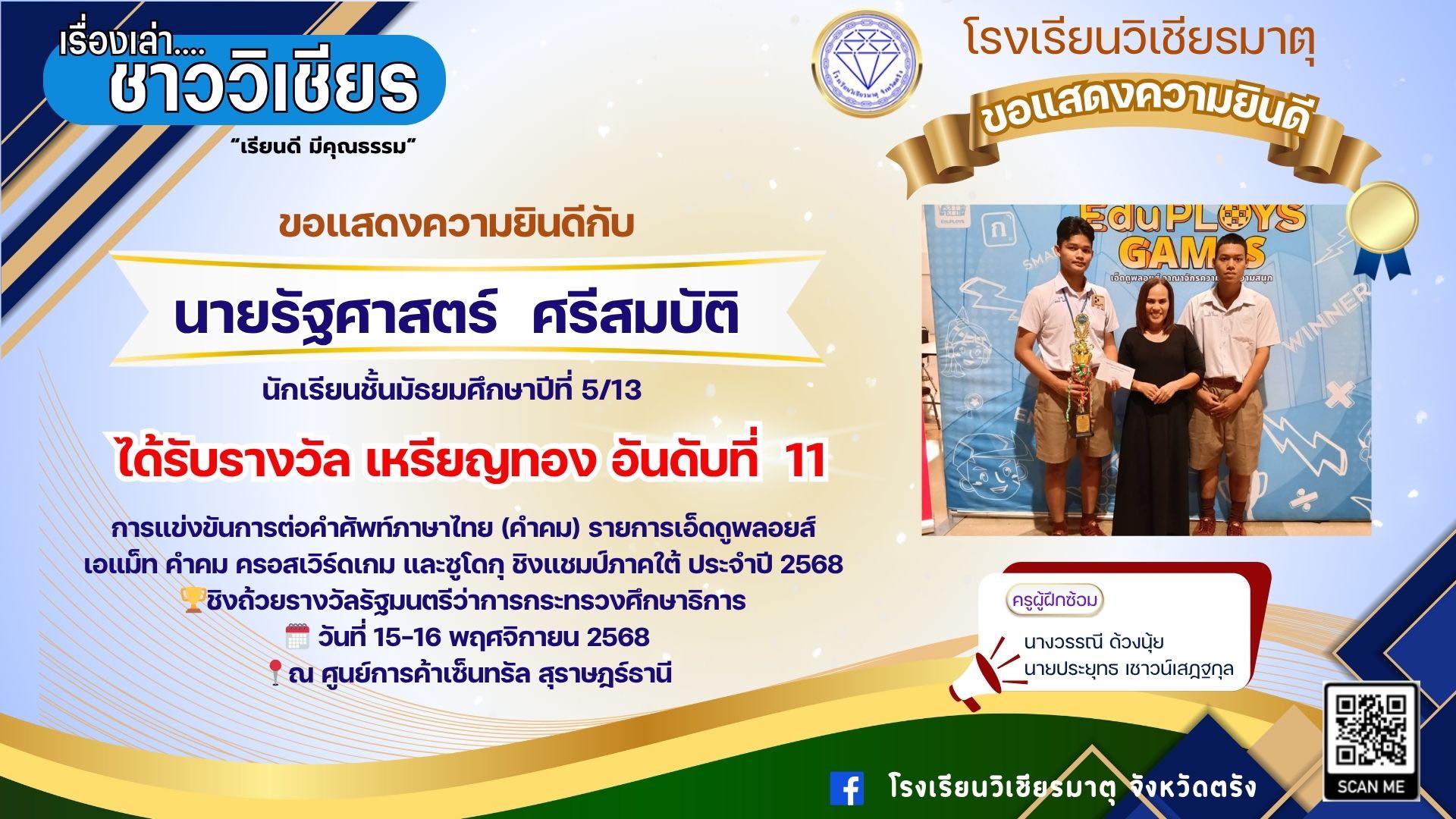 ขอแสดงความยินดีกับนายรัฐศาสตร์ ศรีสมบัติ นักเรียนชั้นมัธยมศึกษาปีที่ 5/13 ได้รับรางวัล เหรียญทอง อันดับที่ 11 ในการแข่งขันการต่อคำศัพท์ภาษาไทย (คำคม)