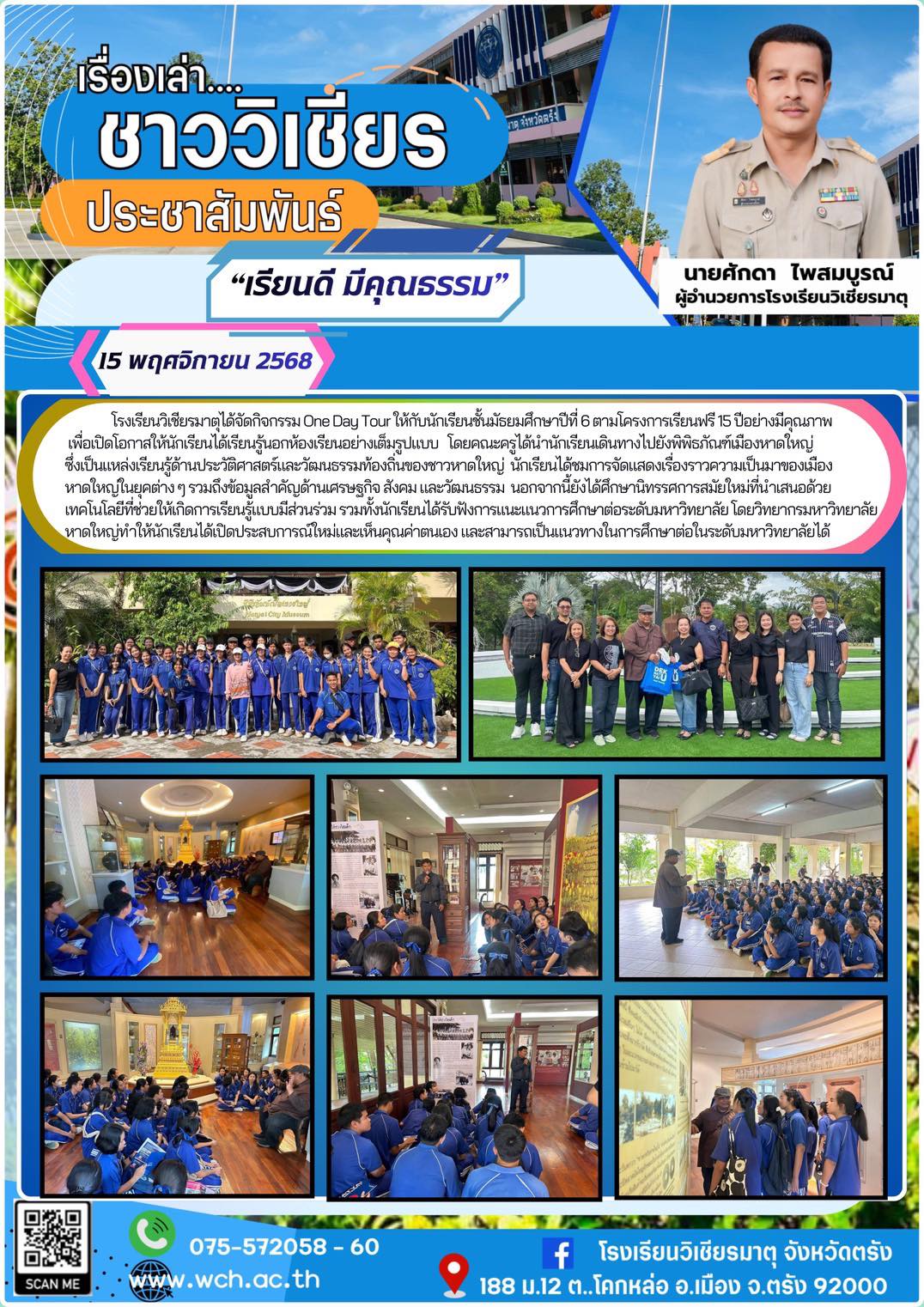 โรงเรียนวิเชียรมาตุได้จัดกิจกรรม One Day Tour ให้กับนักเรียนชั้นมัธยมศึกษาปีที่ 6 ตามโครงการเรียนฟรี 15 ปีอย่างมีคุณภาพ เพื่อเปิดโอกาสให้นักเรียนได้เรียนรู้นอกห้องเรียนอย่างเต็มรูปแบบโดยคณะครูได้นำนักเรียนเดินทางไปยัง พิพิธภัณฑ์เมืองหาดใหญ่ ซึ่งเป็นแหล่งเรียนรู้ด้านประวัติศาสตร์และวัฒนธรรมท้องถิ่นของชาวหาดใหญ่ นักเรียนได้ชมการจัดแสดงเรื่องราวความเป็นมาของเมืองหาดใหญ่ในยุคต่าง ๆ รวมถึงข้อมูลสำคัญด้านเศรษฐกิจ สังคม และวัฒนธรรม นอกจากนี้ยังได้ศึกษานิทรรศการสมัยใหม่ที่นำเสนอด้วยเทคโนโลยีที่ช่วยให้เกิดการเรียนรู้แบบมีส่วนร่วม รวมทั้งนักเรียนได้รับฟังการแนะแนวการศึกษาต่อระดับมหาวิทยาลัย โดยวิทยากรมหาวิทยาลัยหาดใหญ่ ทำให้นักเรียนได้เปิดประสบการณ์ใหม่และเห็นคุณค่าตนเอง และสามารถเป็นแนวทางในการศึกษาต่อในระดับมหาวิทยาลัยได้