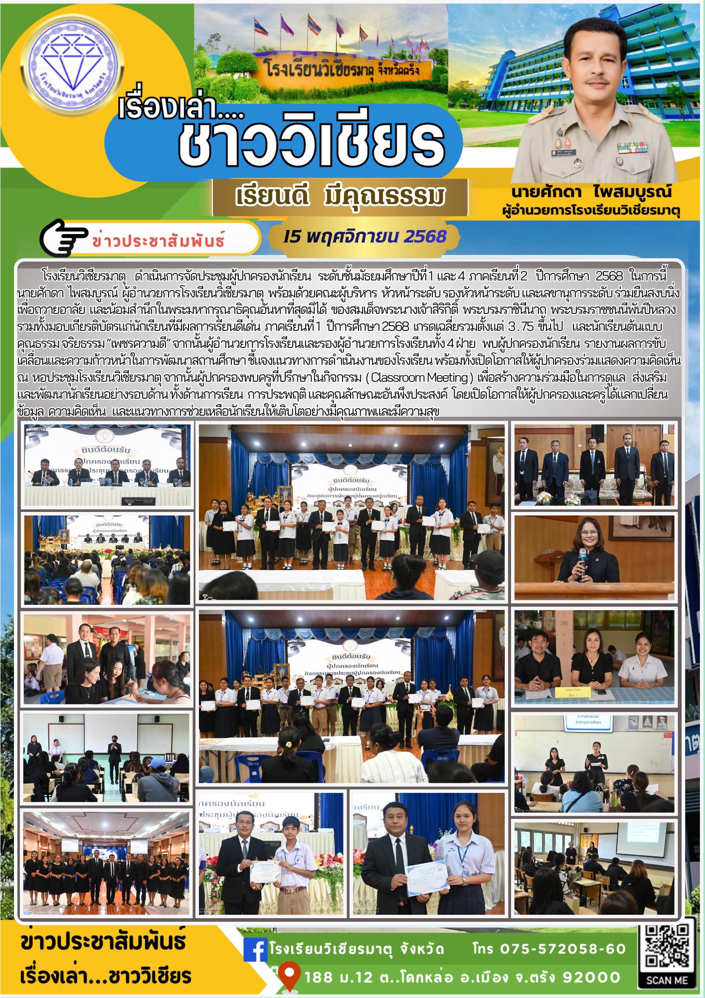 โรงเรียนวิเชียรมาตุ ดำเนินการจัดประชุมผู้ปกครองนักเรียน ระดับชั้นมัธยมศึกษาปีที่ 1 และ 4 ภาคเรียนที่ 2 ปีการศึกษา 2568 ในการนี้ นายศักดา ไพสมบูรณ์ ผู้อำนวยการโรงเรียนวิเชียรมาตุ พร้อมด้วยคณะผู้บริหาร และหัวหน้าระดับ ร่วมยืนสงบนิ่ง เพื่อถวายอาลัย และน้อมสำนึกในพระมหากรุณาธิคุณอันหาที่สุดมิได้ ของสมเด็จพระนางเจ้าสิริกิติ์ พระบรมราชินีนาถ พระบรมราชชนนีพันปีหลวง รวมทั้งมอบเกียรติบัตรแก่นักเรียนที่มีผลการเรียนดีเด่น ภาคเรียนที่ 1 ปีการศึกษา 2568 เกรดเฉลี่ยรวมตั้งแต่ 3.75 ขึ้นไป และนักเรียนต้นแบบคุณธรรม จริยธรรม “เพชรความดี” จากนั้นผู้อำนวยการโรงเรียนและรองผู้อำนวยการโรงเรียนทั้ง 4 ฝ่าย พบผู้ปกครองนักเรียน รายงานผลการขับเคลื่อนและความก้าวหน้าในการพัฒนาสถานศึกษา ชี้แจงแนวทางการดำเนินงานของโรงเรียน พร้อมทั้งเปิดโอกาสให้ผู้ปกครองร่วมแสดงความคิดเห็น ณ หอประชุมโรงเรียนวิเชียรมาตุ จากนั้นผู้ปกครองพบครูที่ปรึกษาในกิจกรรม (Classroom Meeting) เพื่อสร้างความร่วมมือในการดูแล ส่งเสริม และพัฒนานักเรียนอย่างรอบด้าน ทั้งด้านการเรียน การประพฤติ และคุณลักษณะอันพึงประสงค์ โดยเปิดโอกาสให้ผู้ปกครองและครูได้แลกเปลี่ยนข้อมูล ความคิดเห็น และแนวทางการช่วยเหลือนักเรียนให้เติบโตอย่างมีคุณภาพและมีความสุข
