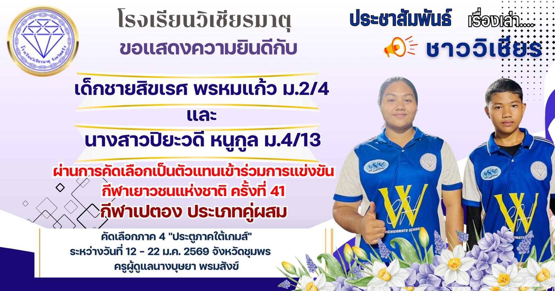 ผ่านการคัดเลือกเป็นตัวแทนเข้าร่วมการแข่งขันกีฬาเยาวชนแห่งชาติ ครั้งที่ 41 คัดเลือกภาค 4 “ประตูภาคใต้เกมส์” ระหว่างวันที่ 12 – 22 ม.ค. 2569 จังหวัดชุมพร