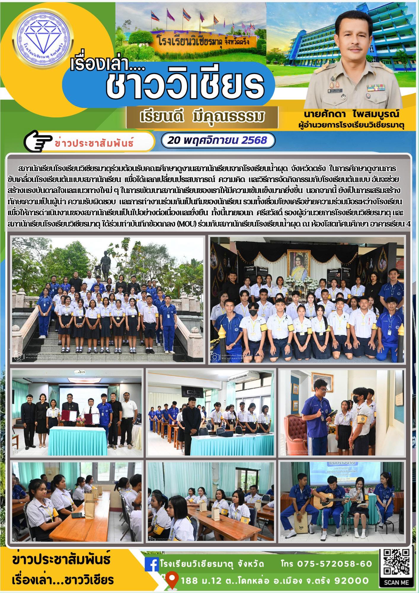 สภานักเรียนโรงเรียนวิเชียรมาตุร่วมต้อนรับคณะศึกษาดูงานสภานักเรียนจากโรงเรียนน้ำผุด จังหวัดตรัง ในการศึกษาดูงานการขับเคลื่อนโรงเรียนต้นแบบสภานักเรียน เพื่อได้แลกเปลี่ยนประสบการณ์ ความคิด และวิธีการจัดกิจกรรมกับโรงเรียนต้นแบบ อันจะช่วยสร้างแรงบันดาลใจและแนวทางใหม่ ๆ ในการพัฒนาสภานักเรียนของเราให้มีความเข้มแข็งมากยิ่งขึ้น นอกจากนี้ ยังเป็นการเสริมสร้างทักษะความเป็นผู้นำ ความรับผิดชอบ และการทำงานร่วมกันเป็นทีมของนักเรียน รวมทั้งเชื่อมโยงเครือข่ายความร่วมมือระหว่างโรงเรียน เพื่อให้การดำเนินงานของสภานักเรียนเป็นไปอย่างต่อเนื่องและยั่งยืน ทั้งนี้นายเอนก ศรีสวัสดิ์ รองผู้อำนวยการโรงเรียนวิเชียรมาตุ และสภานักเรียนโรงเรียนวิเชียรมาตุ ได้ร่วมทำบันทึกข้อตกลง (MOU) ร่วมกับสภานักเรียนโรงเรียนน้ำผุด ณ ห้องโสตทัศนศึกษา อาคารเรียน 4