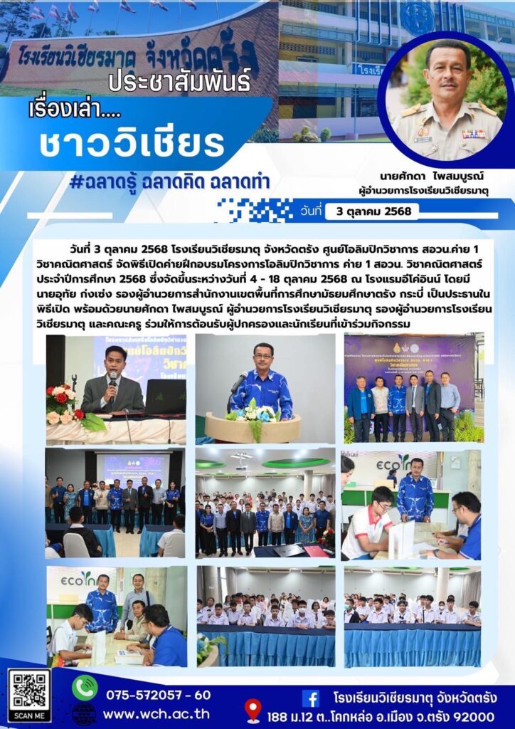 วันที่ 3 ตุลาคม 2568 โรงเรียนวิเชียรมาตุ จังหวัดตรัง ศูนย์โอลิมปิกวิชาการ สอวน.ค่าย 1วิชาคณิตศาสตร์ จัดพิธีเปิดค่ายฝึกอบรมโครงการโอลิมปิกวิชาการ ค่าย 1 สอวน. วิชาคณิตศาสตร์ประจำปีการศึกษา 2568 ซึ่งจัดขึ้นระหว่างวันที่ 4 – 18 ตุลาคม 2568 ณ โรงแรมอีโค่อินน์ โดยมี นายอุทัย ก่งเซ่ง รองผู้อำนวยการสำนักงานเขตพื้นที่การศึกษามัธยมศึกษาตรัง กระบี่ เป็นประธานในพิธีเปิด พร้อมด้วยนายศักดา ไพสมบูรณ์ ผู้อำนวยการโรงเรียนวิเชียรมาตุ รองผูัอำนวยการโรงเรียนวิเชียรมาตุ และคณะครู ร่วมให้การต้อนรับผู้ปกครองและนักเรียนที่เข้าร่วมกิจกรรม