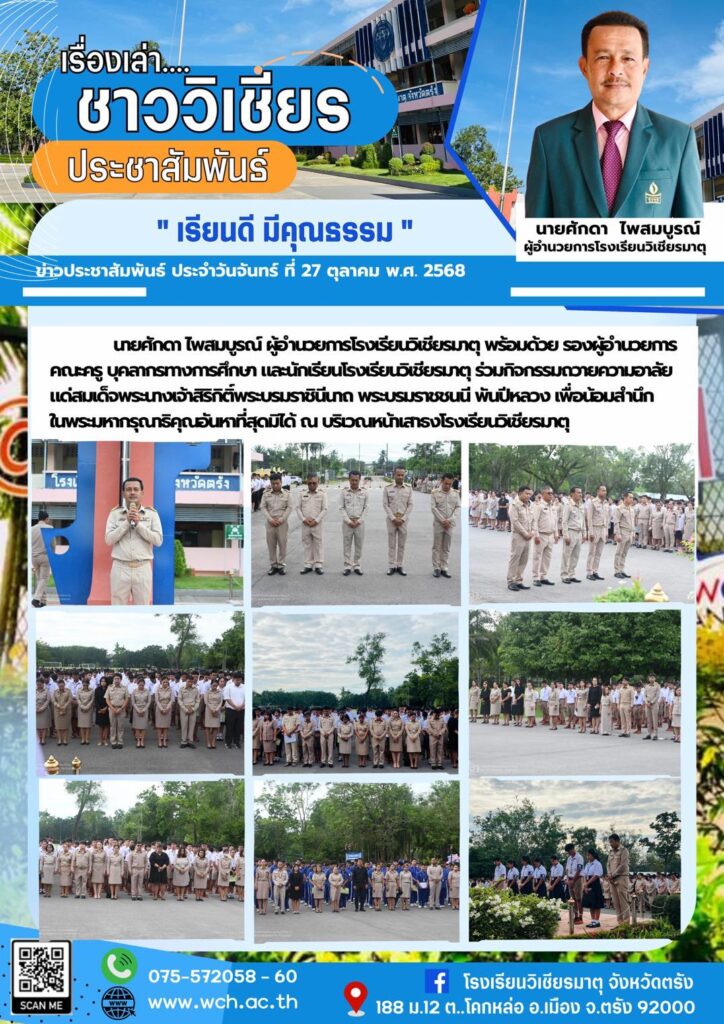 นายศักดา ไพสมบูรณ์ ผู้อำนวยการโรงเรียนวิเชียรมาตุ พร้อมด้วย รองผู้อำนวยการ คณะครู บุคลากรทางการศึกษา และนักเรียนโรงเรียนวิเชียรมาตุ ร่วมกิจกรรมถวายความอาลัยแด่ สมเด็จพระนางเจ้าสิริกิติ์พระบรมราชินีนาถ พระบรมราชชนนี พันปีหลวง เพื่อน้อมสำนึกในพรมหากรุณาธิคุณอันหาที่สุดมิได้ ณ บริเวณหน้าเสาธงโรงเรียนวิเชียรมาตุ
