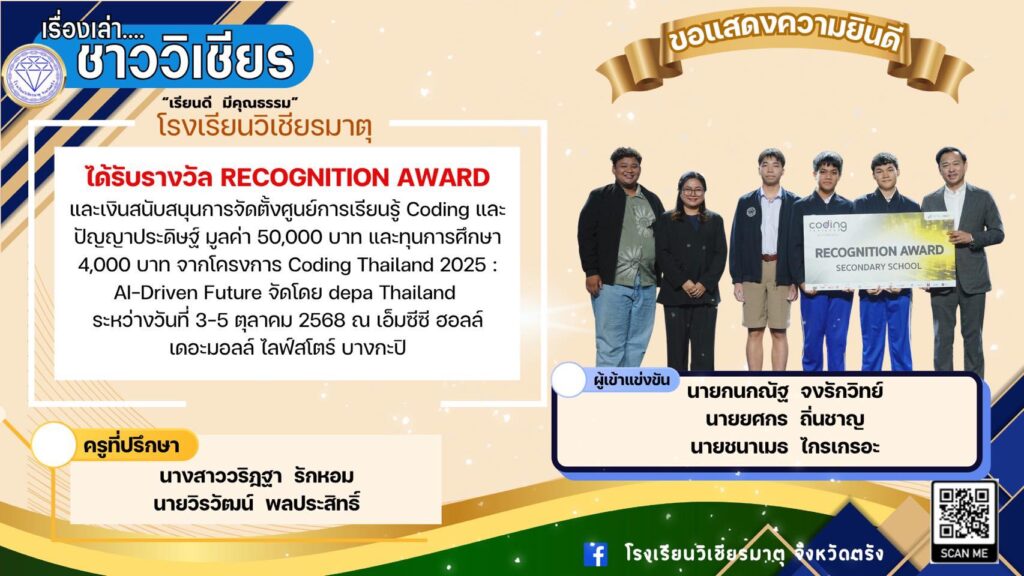 และเงินสนับสนุนการจัดตั้งศูนย์การเรียนรู้ Coding และปัญญาประดิษฐ์ มูลค่า 50,000 บาท และทุนการศึกษา 4,000 บาท จากโครงการ Coding Thailand 2025 : AI-Driven Future จัดโดย depa Thailand ระหว่างวันที่ 3-5 ตุลาคม 2568 ณ เอ็มซีซี ฮอลล์ เดอะมอลล์ ไลฟ์สโตร์ บางกะปิ