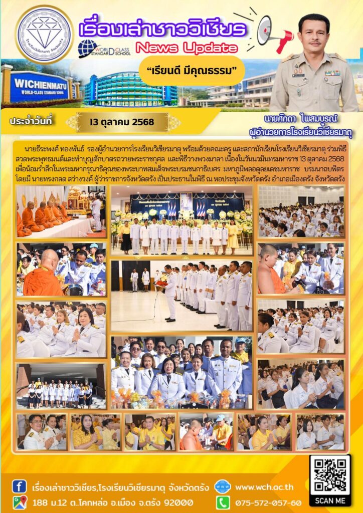 นายธีระพงศ์ ทองพันธ์ รองผู้อำนวยการโรงเรียนวิเชียรมาตุ พร้อมด้วยคณะครู และสภานักเรียนโรงเรียนวิเชียรมาตุ ร่วมพิธีสวดพระพุทธมนต์และทำบุญตักบาตรถวายพระราชกุศล และพิธีวางพวงมาลา เนื่องในวันนวมินทรมหาราช 13 ตุลาคม 2568 เพื่อน้อมรำลึกในพระมหากรุณาธิคุณของพระบาทสมเด็จพระบรมชนกาธิเบศร มหาภูมิพลอดุลยเดชมหาราช บรมนาถบพิตร โดยมี นายทรงกลด สว่างวงศ์ ผู้ว่าราชการจังหวัดตรัง เป็นประธานในพิธี ณ หอประชุมจังหวัดตรัง อำเภอเมืองตรัง จังหวัดตรัง