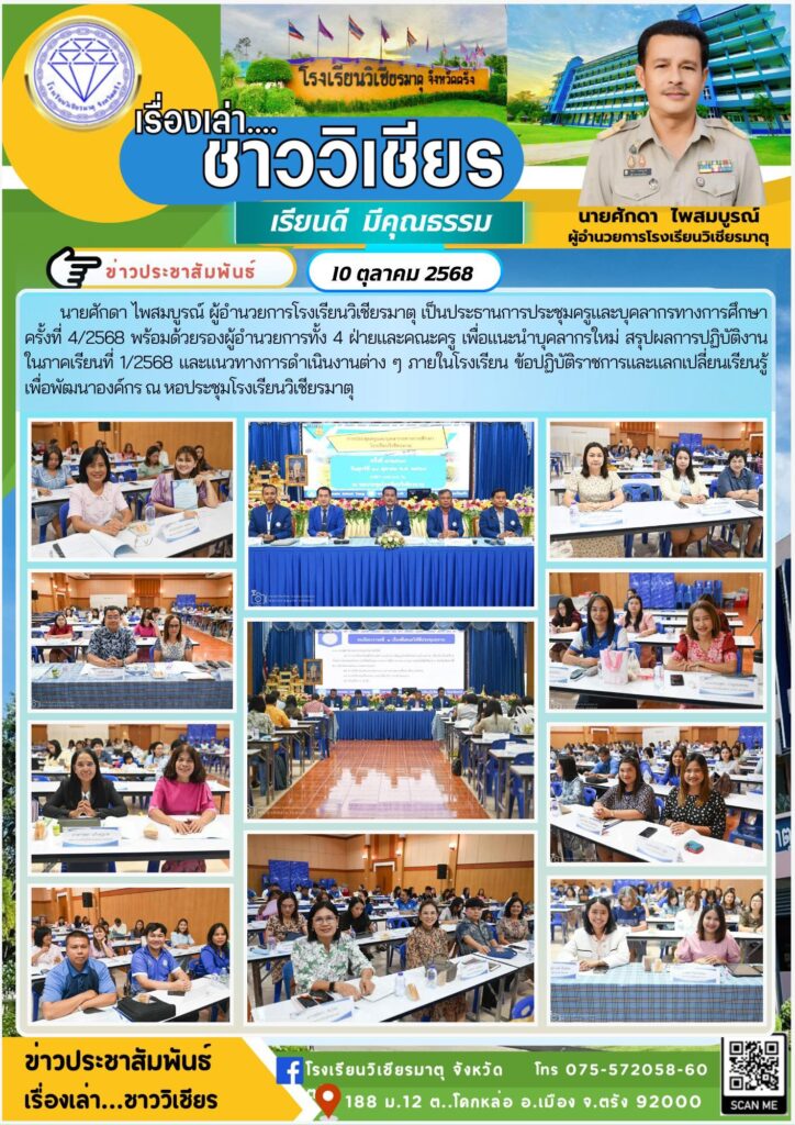 นายศักดา ไพสมบูรณ์ ผู้อำนวยการโรงเรียนวิเชียรมาตุ เป็นประธานการประชุมครูและบุคลากรทางการศึกษา ครั้งที่ 4/2568 พร้อมด้วยรองผู้อำนวยการทั้ง 4 ฝ่ายและคณะครู เพื่อแนะนำบุคลากรใหม่ สรุปผลการปฏิบัติงานในภาคเรียนที่ 1/2568 และแนวทางการดำเนินงานต่าง ๆ ภายในโรงเรียน ข้อปฏิบัติราชการและแลกเปลี่ยนเรียนรู้เพื่อพัฒนาองค์กร ณ หอประชุมโรงเรียนวิเชียรมาตุ