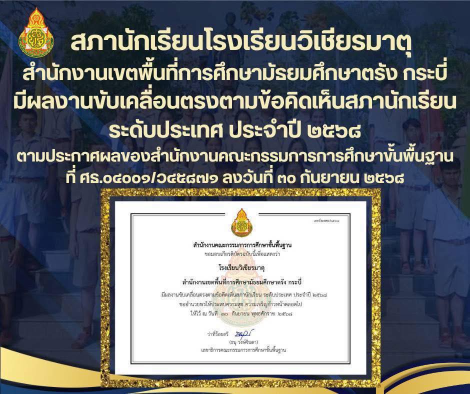 ขอแสดงความยินดี กับสภานักเรียนโรงเรียนวิเชียรมาตุ สำนักงานเขตพื้นที่การศึกษามัธยมศึกษาตรังกระบี่ มีผลงานขับเคลื่อนตรงตามข้อคิดเห็นสภานักเรียน ระดับประเทศ ประจำปี ๒๕๖๘ ตามประกาศผลของสำนักงานคณะกรรมการการศึกษาขั้นพื้นฐานที่ ศธ.๐๔๐๐๑/ว๔๕๘๗๑ ลงวันที่ ๓๐ กันยายน ๒๕๖๘