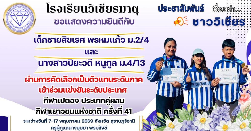 แสดงความยินดีกับเด็กชายสิขเรศ พรหมแก้ว ม.2/4 และ นางสาวปิยะวดี หนูกุล ม.4/13 ผ่านการคัดเลือกเป็นตัวแทนระดับภาคเข้าร่วมแข่งขันระดับประเทศ กีฬาเปตอง ประเภทคู่ผสม กีฬาเยาวชนแห่งชาติ ครั้งที่ 41 ระหว่างวันที่ 7-17 พฤษภาคม 2569 ณ จังหวัดสุราษฎร์ธานี