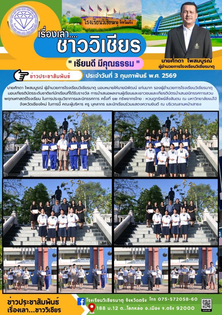 นายศักดา ไพสมบูรณ์ ผู้อำนวยการโรงเรียนวิเชียรมาตุ มอบหมายให้นายนิพัฒน์ แท่นมาก รองผู้อำนวยการโรงเรียนวิเชียรมาตุ มอบเกียรติบัตรระดับชาติแก่นักเรียนที่ได้รับรางวัล การนำเสนอผลงานผู้เรียนและเยาวชนและเกียรติบัตรนำเสนอนิทรรศการสวนพฤกษศาสตร์โรงเรียน ในการประชุมวิชาการและนิทรรศการ ครั้งที่ ๑๒ ทรัพยากรไทย : หวนดูทรัพย์สิ่งสินตน ณ มหาวิทยาลัยแม่โจ้ จังหวัดเชียงใหม่ ในการนี้ คณะผู้บริหาร ครู บุคลากร และนักเรียนร่วมแสดงความยินดี ณ บริเวณลานหน้าเสาธง
