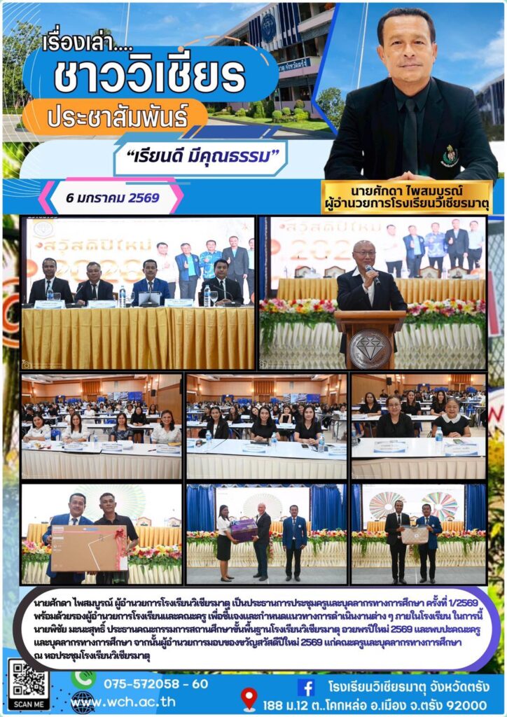 นายศักดา ไพสมบูรณ์ ผู้อำนวยการโรงเรียนวิเชียรมาตุ เป็นประธานการประชุมครูและบุคลากรทางการศึกษา ครั้งที่ 1/2569 พร้อมด้วยรองผู้อำนวยการโรงเรียนและคณะครู เพื่อชี้แจงและกำหนดแนวทางการดำเนินงานต่าง ๆ ภายในโรงเรียน ในการนี้ นายพิชัย มะนะสุทธิ์ ประธานคณะกรรมการสถานศึกษาขั้นพื้นฐานโรงเรียนวิเชียรมาตุ อวยพรปีใหม่ 2569 และพบปะคณะครูและบุคลากรทางการศึกษา จากนั้นผู้อำนวยการมอบของขวัญสวัสดีปีใหม่ 2569 แก่คณะครูและบุคลากรทางการศึกษา ณ หอประชุมโรงเรียนวิเชียรมาตุ