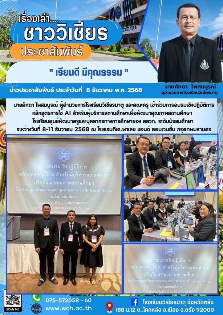 นายศักดา ไพสมบูรณ์ ผู้อำนวยการโรงเรียนวิเชียรมาตุ และคณะครู เข้าร่วมการอบรมเชิงปฏิบัติการหลักสูตรการใช้ AI สำหรับผู้บริหารสถานศึกษาเพื่อพัฒนาคุณภาพสถานศึกษา โรงเรียนศูนย์พัฒนาครูและบุคลากรทางการศึกษาของ สสวท. ระดับมัธยมศึกษา ระหว่างวันที่ 8-11 ธันวาคม 2568 ณ โรงแรมทีเค.พาเลช แอนด์ คอนเวนชั่น กรุงเทพมหานคร