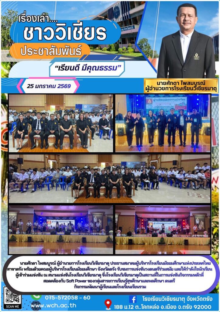 นายศักดา ไพสมบูรณ์ ผู้อำนวยการโรงเรียนวิเชียรมาตุ ประธานสมาคมผู้บริหารโรงเรียนมัธยมศึกษาแห่งประเทศไทยสาขาตรัง พร้อมด้วยคณะผู้บริหารโรงเรียนมัธยมศึกษา จังหวัดตรัง รับชมการแข่งขันวงดนตรีร่วมสมัย และให้กำลังใจนักเรียนผู้เข้าร่วมแข่งขัน ณ สนามแข่งขันโรงเรียนวิเชียรมาตุ ซึ่งโรงเรียนวิเชียรมาตุเป็นสถานที่ในการแข่งขันกิจกรรมหลักที่สอดคล้องกับ Soft Power ของกลุ่มสาระการเรียนรู้สุขศึกษาและพลศึกษา ดนตรี กิจกรรมพัฒนาผู้เรียนและโรงเรียนเรียนรวม