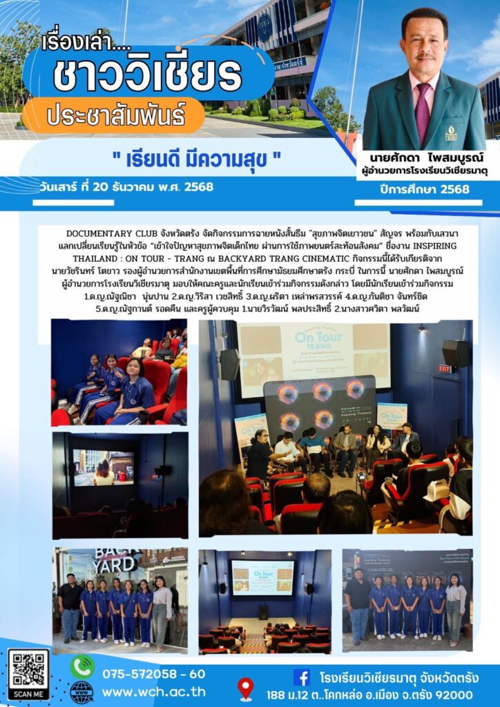 Documentary Club จังหวัดตรัง จัดกิจกรรมการฉายหนังสั้นธีม “สุขภาพจิตเยาวชน” สัญจร พร้อมกับเสวนา แลกเปลี่ยนเรียนรู้ในหัวข้อ “เข้าใจปัญหาสุขภาพจิตเด็กไทย ผ่านการใช้ภาพยนตร์สะท้อนสังคม” ชื่องาน Inspiring Thailand : On Tour – TRANG ณ Backyard Trang CINEmatic กิจกรรมนี้ได้รับเกียรติจาก นายวัชรินทร์ โตขาว รองผู้อำนวยการสำนักงานเขตพื้นที่การศึกษามัธยมศึกษาตรัง กระบี่ ในการนี้ นายศักดา ไพสมบูรณ์ ผู้อำนวยการโรงเรียนวิเชียรมาตุ มอบให้หมายให้คณะครูและนักเรียนเข้าร่วมกิจกรรมดังกล่าว โดยมีนักเรียนเข้าร่วมกิจกรรม 1.ด.ญ.ณัฐณิชา นุ่นปาน 2.ด.ญ.วิริสา เวชสิทธิ์ 3.ด.ญ.ผริตา เหล่าพรสวรรค์ 4.ด.ญ.กันติชา จันทร์ชิด 5.ด.ญ.ณัฐกานต์ รอดคืน และครูผู้ควบคุม 1.นายวิรวัฒน์ พลประสิทธิ์ 2.นางสาวศวิตา พลวัฒน์