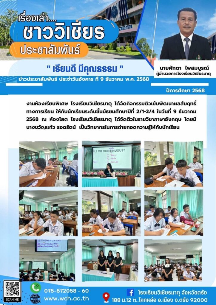 งานห้องเรียนพิเศษ โรงเรียนวิเชียรมาตุ ได้จัดกิจกรรมติวเข้มพัฒนาผลสัมฤทธิ์ทางการเรียน ให้กับนักเรียนระดับชั้นมัธยมศึกษาปีที่ 2/1-2/4 ในวันที่ 9 ธันวาคม 2568 ณ ห้องโสต โรงเรียนวิเชียรมาตุ ได้จัดติวในรายวิชาภาษาอังกฤษ โดยมี นางขวัญแก้ว รอดรัตน์ เป็นวิทยากรในการถ่ายทอดความรู้ให้กับนักเรียน