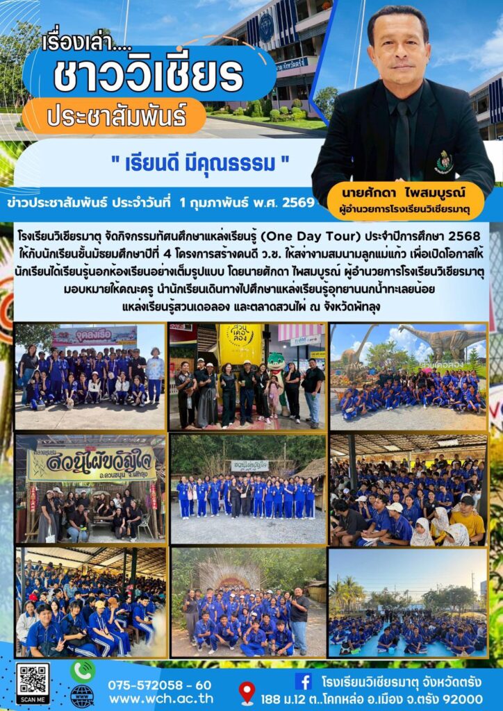 โรงเรียนวิเชียรมาตุ จัดกิจกรรมทัศนศึกษาแหล่งเรียนรู้ (One Day Tour) ประจำปีการศึกษา 2568 ให้กับนักเรียนชั้นมัธยมศึกษาปีที่ 4 โครงการสร้างคนดี ว.ช. ให้สง่างามสมนามลูกแม่แก้ว เพื่อเปิดโอกาสให้นักเรียนได้เรียนรู้นอกห้องเรียนอย่างเต็มรูปแบบ โดยนายศักดา ไพสมบูรณ์ ผู้อำนวยการโรงเรียนวิเชียรมาตุ มอบหมายให้คณะครู นำนักเรียนเดินทางไปศึกษาแหล่งเรียนรู้อุทยานนกน้ำทะเลยน้อย แหล่งเรียนรู้สวนเดอลอง และตลาดสวนไผ่ ณ จังหวัดพัทลุง