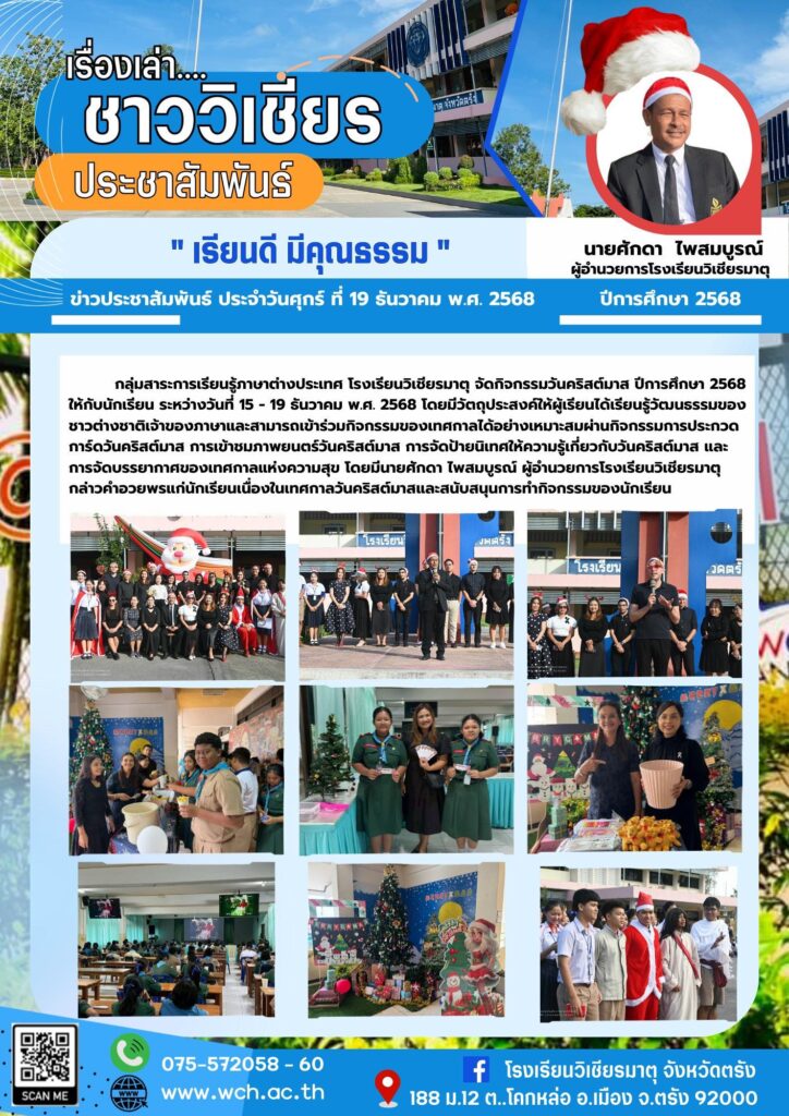 กลุ่มสาระการเรียนรู้ภาษาต่างประเทศ โรงเรียนวิเชียรมาตุ จัดกิจกรรมวันคริสต์มาส ปีการศึกษา 2568 ให้กับนักเรียน ระหว่างวันที่ 15 – 19 ธันวาคม พ.ศ. 2568 โดยมีกิจกรรมการประกวดการ์ดวันคริสต์มาส การเข้าชมภาพยนตร์วันคริสต์มาส การจัดป้ายนิเทศให้ความรู้เกี่ยวกับวันคริสต์มาส และการจัดบรรยากาศของเทศกาลแห่งความสุข โดยมีนายศักดา ไพสมบูรณ์ ผู้อำนวยการโรงเรียนวิเชียรมาตุกล่าวคำอวยพรแก่นักเรียนเนื่องในเทศกาลวันคริสต์มาสและสนับสนุนการทำกิจกรรมของนักเรียน