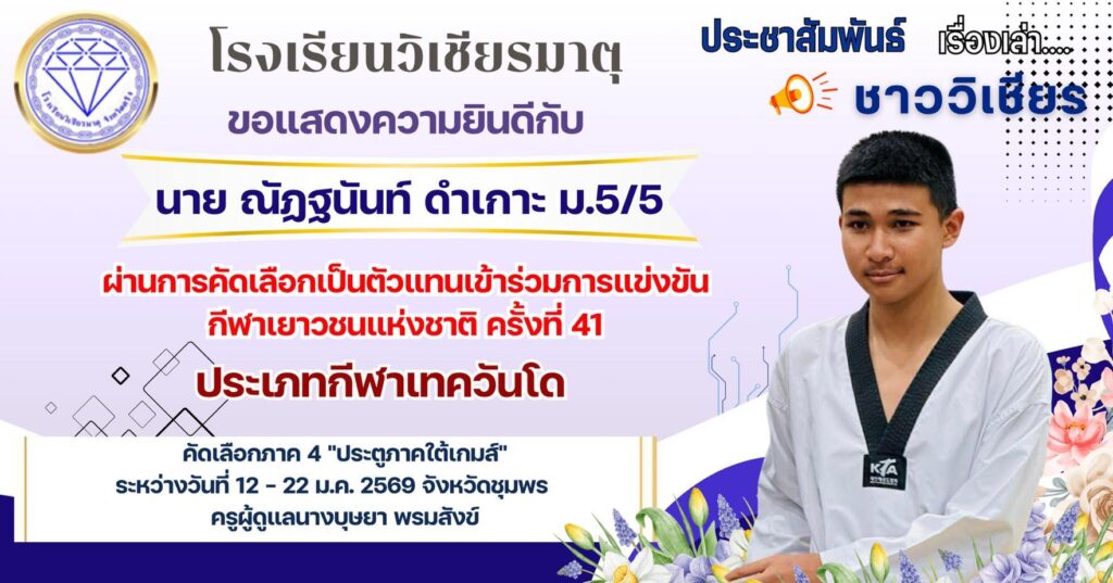 ขอแสดงความยินดีกับ นายณัฏฐนันท์ ดำเกาะ ม.5/5 ประเภทกีฬาเทควันโด