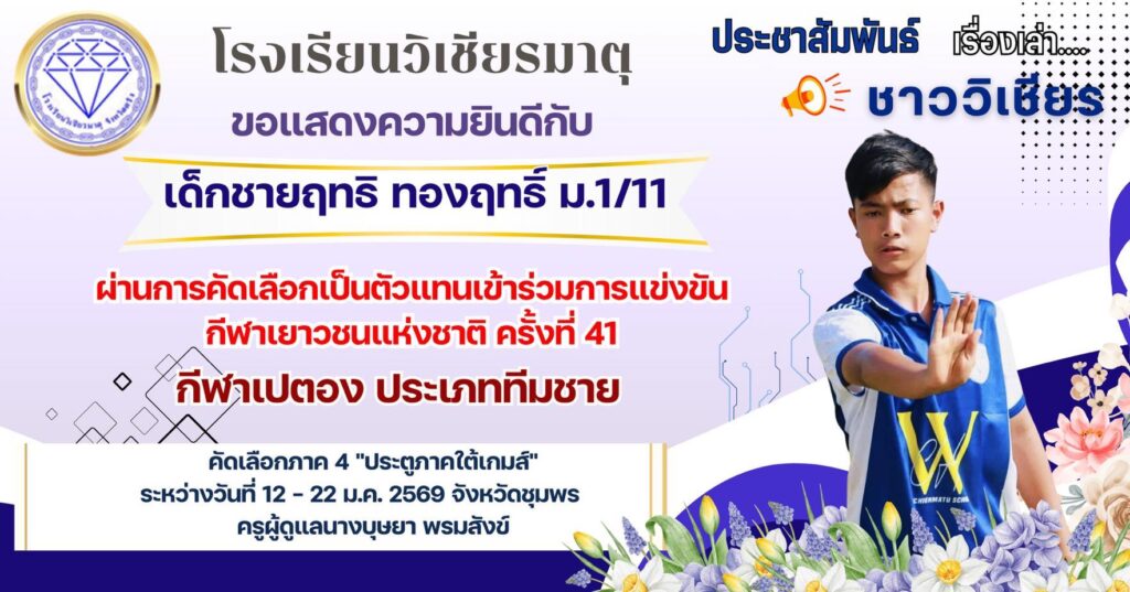 ผ่านการคัดเลือกเป็นตัวแทนเข้าร่วมการแข่งขันกีฬาเยาวชนแห่งชาติ ครั้งที่ 41 คัดเลือกภาค 4 “ประตูภาคใต้เกมส์” ระหว่างวันที่ 12 – 22 ม.ค. 2569 จังหวัดชุมพร
