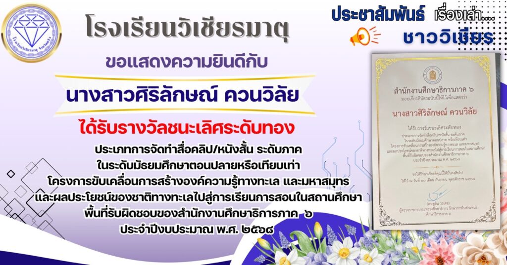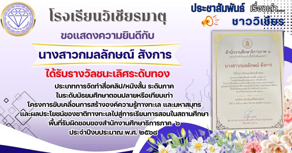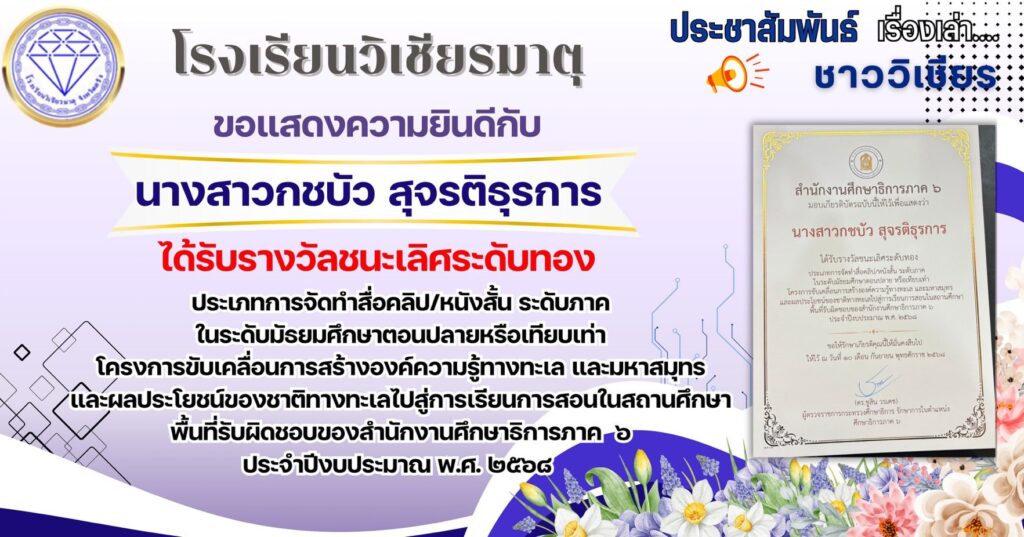 ได้รับรางวัลชนะเลิศระดับทอง ประเภทการจัดทำสื่อคลิป/หนังสั้น ระดับภาคในระดับมัธยมศึกษาตอนปลายหรือเทียบเท่าโครงการขับเคลื่อนการสร้างองค์ความรู้ทางทะเล และมหาสมุทรและผลประโยชน์ของชาติทางทะเลไปสู่การเรียนการสอนในสถานศึกษาพื้นที่รับผิดชอบของสำนักงานศึกษาธิการภาค ๖ ประจำปีงบประมาณ พ.ศ. ๒๕๖๘