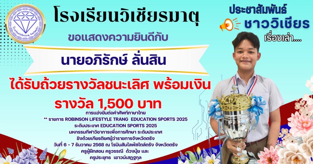 ขอแสดงความยินดีกับนายอภิรักษ์ ลั่นสินนักเรียนชั้นมัธยมศึกษาปีที่ 4/7 ได้รับถ้วยรางวัลชนะเลิศ พร้อมเงินรางวัล 1,500 บาทการแข่งขันต่อคำศัพท์ภาษาไทย