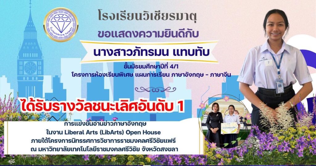 ขอแสดงความยินดีกับ น.ส.ภัทรมน แทบทับ นักเรียนระดับชั้นมัธยมศึกษาปีที่ 4/1 ได้รับรางวัลชนะเลิศ รางวัล 500 บาท ในรายการแข่งขันอ่านข่าวภาษาอังกฤษ ในงาน Liberal Arts (LibArts) Open House ภายใต้โครงการนิทรรศการวิชาการราชมงคลศรีวิชัยแฟร์