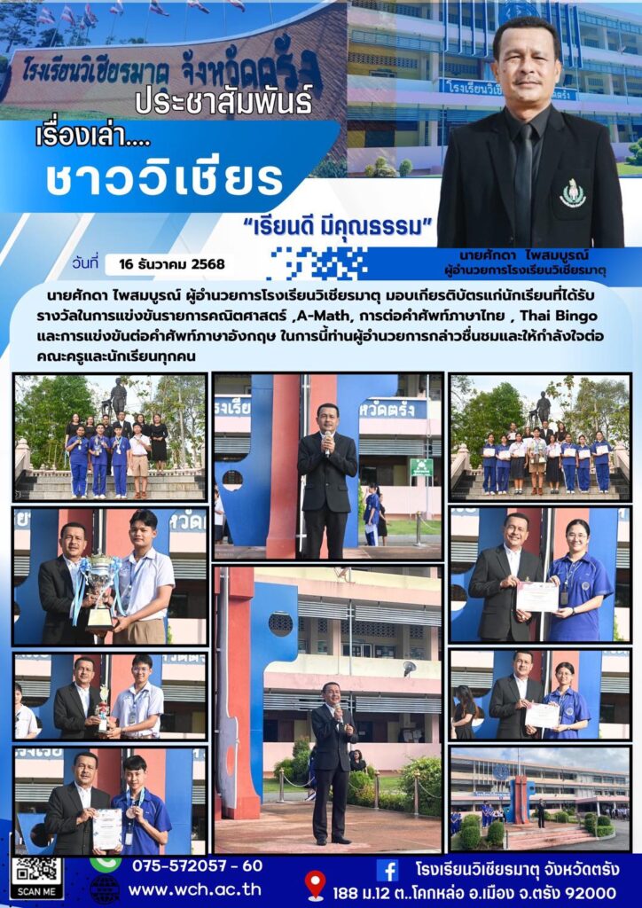 นายศักดา ไพสมบูรณ์ ผู้อำนวยการโรงเรียนวิเชียรมาตุ มอบเกียรติบัตรแก่นักเรียนที่ได้รับรางวัลในการแข่งขันรายการคณิตศาสตร์ ,A-Math, การต่อคำศัพท์ภาษาไทย , Thai Bingo และการแข่งขันต่อคำศัพท์ภาษาอังกฤษ ในการนี้ท่านผู้อำนวยการกล่าวชื่นชมและให้กำลังใจต่อคณะครูและนักเรียนทุกคน