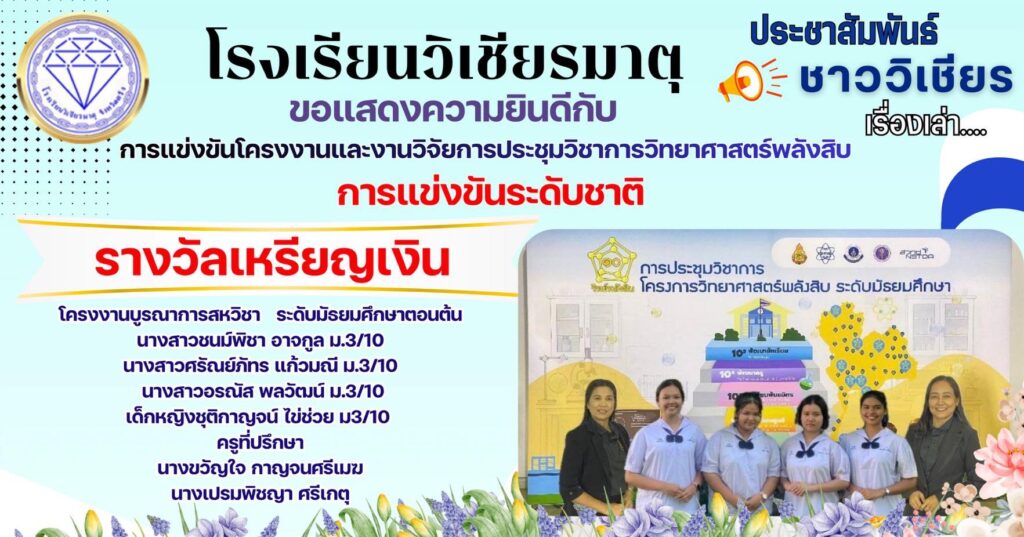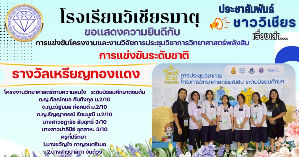 โรงเรียนวิเชียรมาตุขอแสดงความยินดีกับการแข่งขันโครงงานและงานวิจัยการประชุมวิชาการวิทยาศาสตร์พลังสิบ การแข่งขันระดับชาติ