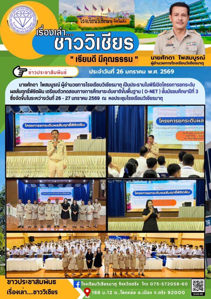 นายศักดา ไพสมบูรณ์ ผู้อำนวยการโรงเรียนวิเชียรมาตุ เป็นประธานในพิธีเปิดโครงการยกระดับผลสัมฤทธิ์พิชิตฝัน เตรียมตัวทดสอบทางการศึกษาระดับชาติขั้นพื้นฐาน ( O-NET ) ชั้นมัธยมศึกษาปีที่ 3 ซึ่งจัดขึ้นในระหว่างวันที่ 26 – 27 มกราคม 2569 ณ หอประชุมโรงเรียนวิเชียรมาตุ