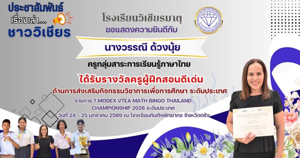 ขอแสดงความยินดีกับนางวรรณี ด้วงนุ้ย ครูกลุ่มสาระการเรียนรู้ภาษาไทย ได้รับรางวัลครูผู้ฝึกสอนดีเด่น ด้านการส่งเสริมกิจกรรมวิชาการเพื่อการศึกษา ระดับประเทศรายการ T.MODEX VTEA MATH BINGO THAILAND