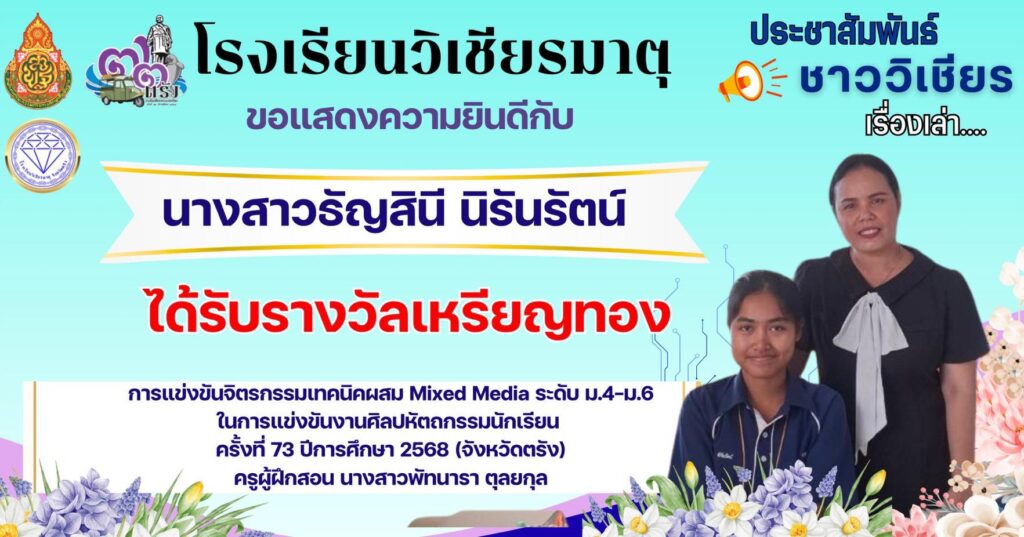 นางสาวธัญสินี นิรันรัตน์ ได้รับรางวัล เหรียญทองการแข่งขันจิตรกรรมเทคนิคผสม Mixed Media ระดับ ม.4-ม.6 ในการแข่งขันงานศิลปหัตถกรรมนักเรียน ครั้งที่ 73 ปีการศึกษา 2568 (จังหวัดตรัง)