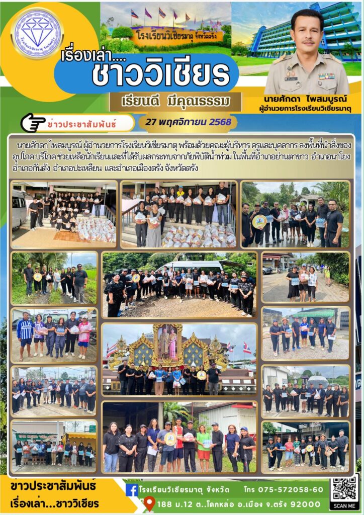 นายศักดา ไพสมบูรณ์ ผู้อำนวยการโรงเรียนวิเชียรมาตุ พร้อมด้วยคณะผู้บริหาร ครูและบุคลากร ลงพื้นที่นำสิ่งของอุปโภค บริโภค ช่วยเหลือนักเรียนและที่ได้รับผลกระทบจากภัยพิบัติน้ำท่วม ในพื้นที่อำเภอย่านตาขาว อำเภอนาโยง อำเภอกันตัง อำเภอปะเหลียน และอำเภอเมืองตรัง จังหวัดตรัง