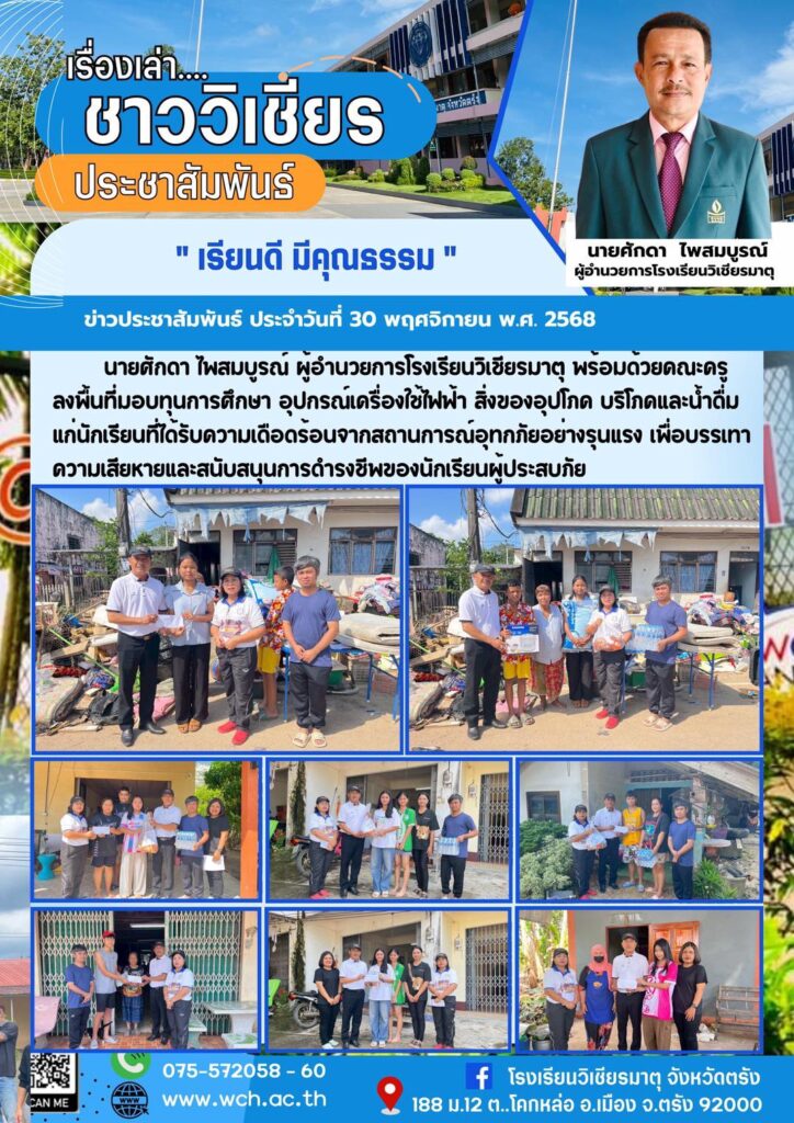 นายศักดา ไพสมบูรณ์ ผู้อำนวยการโรงเรียนวิเชียรมาตุ พร้อมด้วยคณะครูลงพื้นที่มอบทุนการศึกษา อุปกรณ์เครื่องใช้ไฟฟ้า สิ่งของอุปโภค บริโภคและน้ำดื่ม แก่นักเรียนที่ได้รับความเดือดร้อนจากสถานการณ์อุทกภัยอย่างรุนแรง เพื่อบรรเทาความเสียหายและสนับสนุนการดำรงชีพของนักเรียนผู้ประสบภัย