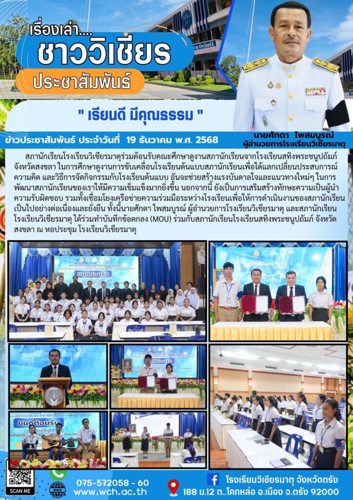 สภานักเรียนโรงเรียนวิเชียรมาตุร่วมต้อนรับคณะศึกษาดูงานสภานักเรียนจากโรงเรียนสทิงพระชนูปถัมภ์ จังหวัดสงขลา ในการศึกษาดูงานการขับเคลื่อนโรงเรียนต้นแบบสภานักเรียนเพื่อได้แลกเปลี่ยนประสบการณ์ ความคิด และวิธีการจัดกิจกรรมกับโรงเรียนต้นแบบ อันจะช่วยสร้างแรงบันดาลใจและแนวทางใหม่ๆ ในการพัฒนาสภานักเรียนของเราให้มีความเข็มแข็งมากยิ่งขึ้น นอกจากนี้ ยังเป็นการเสริมสร้างทักษะความเป็นผู้นำ ความรับผิดชอบ รวมทั้งเชื่อมโยงเครือข่ายความร่วมมือระหว่างโรงเรียนเพื่อให้การดำเนินงานของสภานักเรียนเป็นไปอย่างต่อเนื่องและยั่งยืน ทั้งนี้นายศักดา ไพสมบูรณ์ ผู้อำนวยการโรงเรียนวิเชียรมาตุ และสภานักเรียนโรงเรียนวิเชียรมาตุ ได้ร่วมทำบันทึกข้อตกลง (MOU) ร่วมกับสภานักเรียนสทิงพระชนูปถัมภ์ จังหวัดสงขลา ณ หอประชุม โรงเรียนวิเชียรมาตุ