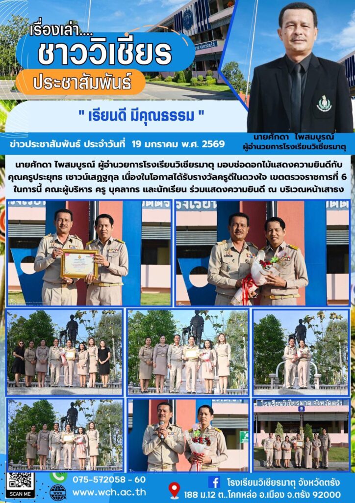 นายศักดา ไพสมบูรณ์ ผู้อำนวยการโรงเรียนวิเชียรมาตุ มอบช่อดอกไม้แสดงความยินดีกับคุณครูประยุทธ เชาวน์เสฏฐกุล เนื่องในโอกาสได้รับรางวัลครูดีในดวงใจ เขตตรวจราชการที่ 6 ในการนี้ คณะผู้บริหาร ครู บุคลากร และนักเรียน ร่วมแสดงความยินดี ณ บริเวณหน้าเสาธง