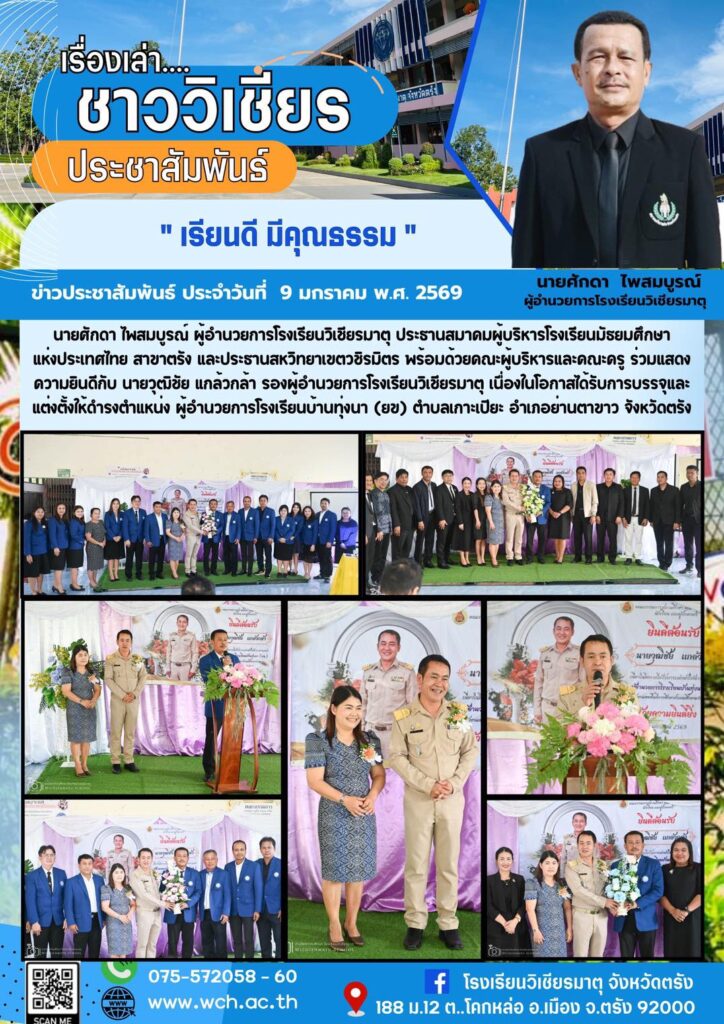 นายศักดา ไพสมบูรณ์ ผู้อำนวยการโรงเรียนวิเชียรมาตุ ประธานสมาคมผู้บริหารโรงเรียนมัธยมศึกษาแห่งประเทศไทย สาขาตรัง และประธานสหวิทยาเขตวชิรมิตร พร้อมด้วยคณะผู้บริหารและคณะครู ร่วมแสดงความยินดีกับ นายวุฒิชัย แกล้วกล้า รองผู้อำนวยการโรงเรียนวิเชียรมาตุ เนื่องในโอกาสได้รับการบรรจุและแต่งตั้งให้ดำรงตำแหน่ง ผู้อำนวยการโรงเรียนบ้านทุ่งนา (ยข) ตำบลเกาะเปียะ อำเภอย่านตาขาว จังหวัดตรัง
