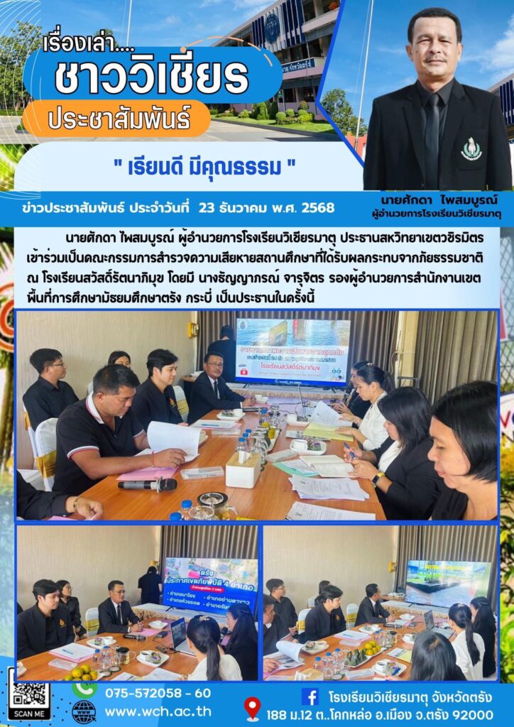 นายศักดา ไพสมบูรณ์ ผู้อำนวยการโรงเรียนวิเชียรมาตุ ประธานสหวิทยาเขตวชิรมิตรเข้าร่วมเป็นคณะกรรมการสำรวจความเสียหายสถานศึกษาที่ได้รับผลกระทบจากภัยธรรมชาติ ณ โรงเรียนสวัสดิ์รัตนาภิมุข โดยมี นางธัญญาภรณ์ จารุจิตร รองผู้อำนวยการสำนักงานเขตพื้นที่การศึกษามัธยมศึกษาตรัง กระบี่ เป็นประธานในครั้งนี้