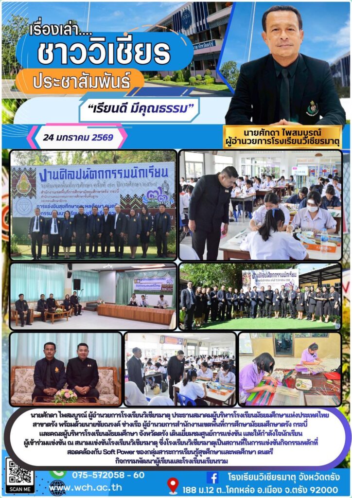 นายศักดา ไพสมบูรณ์ ผู้อำนวยการโรงเรียนวิเชียรมาตุ ประธานสมาคมผู้บริหารโรงเรียนมัธยมศึกษาแห่งประเทศไทย สาขาตรัง พร้อมด้วยนายชัยณรงค์ ช่างเรือ ผู้อำนวยการ สำนักงานเขตพื้นที่การศึกษามัธยมศึกษาตรัง กระบี่ และคณะผู้บริหารโรงเรียนมัธยมศึกษา จังหวัดตรัง เดินเยี่ยมชมศูนย์การแข่งขัน และให้กำลังใจนักเรียนผู้เข้าร่วมแข่งขัน ณ สนามแข่งขันโรงเรียนวิเชียรมาตุ ซึ่งโรงเรียนวิเชียรมาตุเป็นสถานที่ในการแข่งขันกิจกรรมหลักที่สอดคล้องกับ Soft Power ของกลุ่มสาระการเรียนรู้สุขศึกษาและพลศึกษา ดนตรี กิจกรรมพัฒนาผู้เรียนและโรงเรียนเรียนรวม