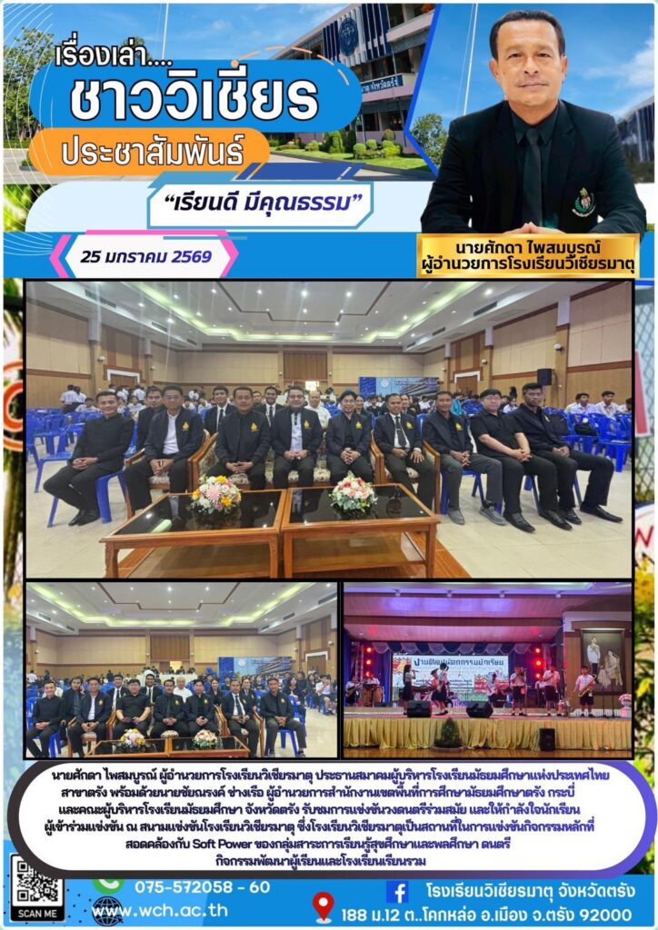 นายศักดา ไพสมบูรณ์ ผู้อำนวยการโรงเรียนวิเชียรมาตุ ประธานสมาคมผู้บริหารโรงเรียนมัธยมศึกษาแห่งประเทศไทยสาขาตรัง พร้อมด้วยนายชัยณรงค์ ช่างเรือ ผู้อำนวยการสำนักงานเขตพื้นที่การศึกษามัธยมศึกษาตรัง กระบี่ และคณะผู้บริหารโรงเรียนมัธยมศึกษา จังหวัดตรัง รับชมการแข่งขันวงดนตรีร่วมสมัย และให้กำลังใจนักเรียนผู้เข้าร่วมแข่งขัน ณ สนามแข่งขันโรงเรียนวิเชียรมาตุ ซึ่งโรงเรียนวิเชียรมาตุเป็นสถานที่ในการแข่งขันกิจกรรมหลักที่สอดคล้องกับ Soft Power ของกลุ่มสาระการเรียนรู้สุขศึกษาและพลศึกษา ดนตรี กิจกรรมพัฒนาผู้เรียนและโรงเรียนเรียนรวม
