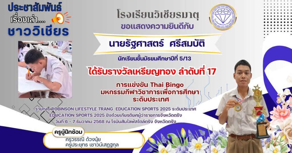 ขอแสดงความยินดีกับ นายรัฐศาสตร์ ศรีสมบัติ นักเรียนชั้นมัธยมศึกษาปีที่ 5/13 ได้รับรางวัลเหรียญทอง🏅ลำดับที่ 17 การแข่งขัน Thai Bingo