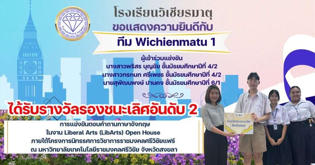 ได้รับรางวัลรองชนะเลิศอันดับ 2 เงินรางวัล 300 บาทรายการแข่งขันตอบปัญหาภาษาอังกฤษ ในงาน Liberal Arts (LibArts) Open House ภายใต้โครงการนิทรรศการวิชาการราชมงคลศรีวิชัยแฟร์ ณ คณะศิลปศาสตร์มหาวิทยาลัยเทคโนโลยีราชมงคลศรีวิชัย จังหวัดสงขลา โดยครูผู้ฝึกซ้อม นางสาวพรธิดา ชูพูล