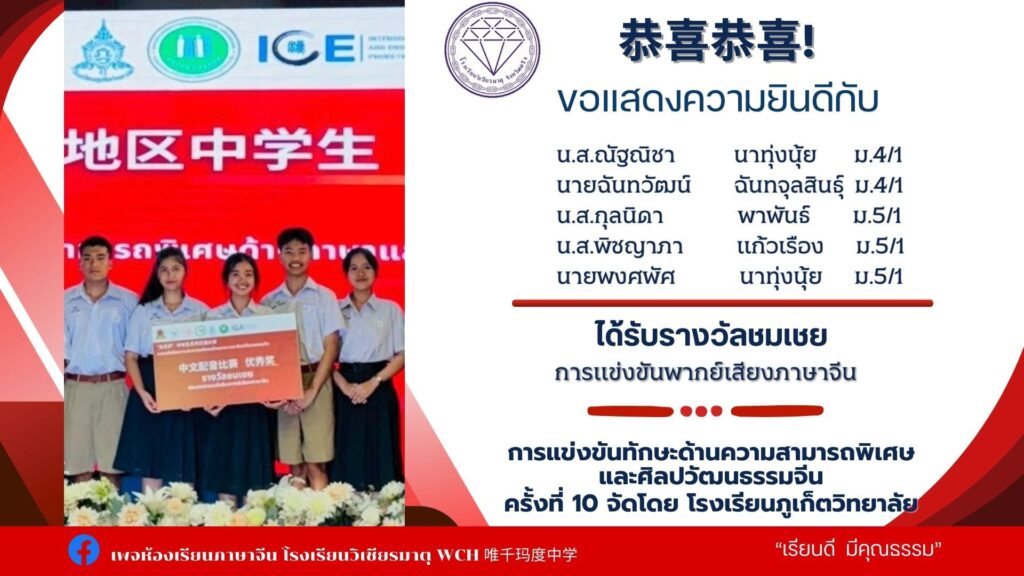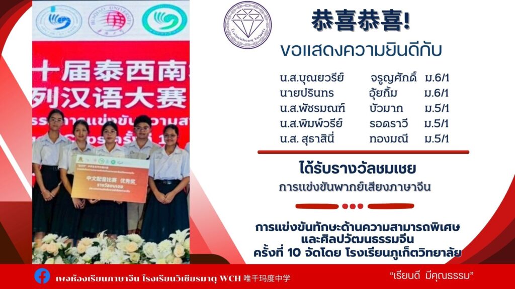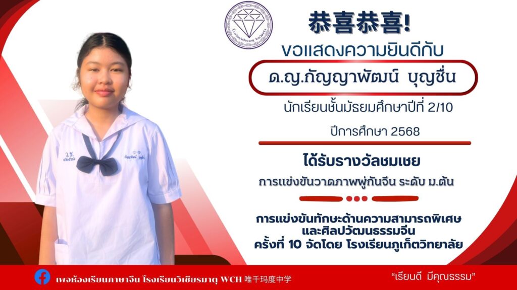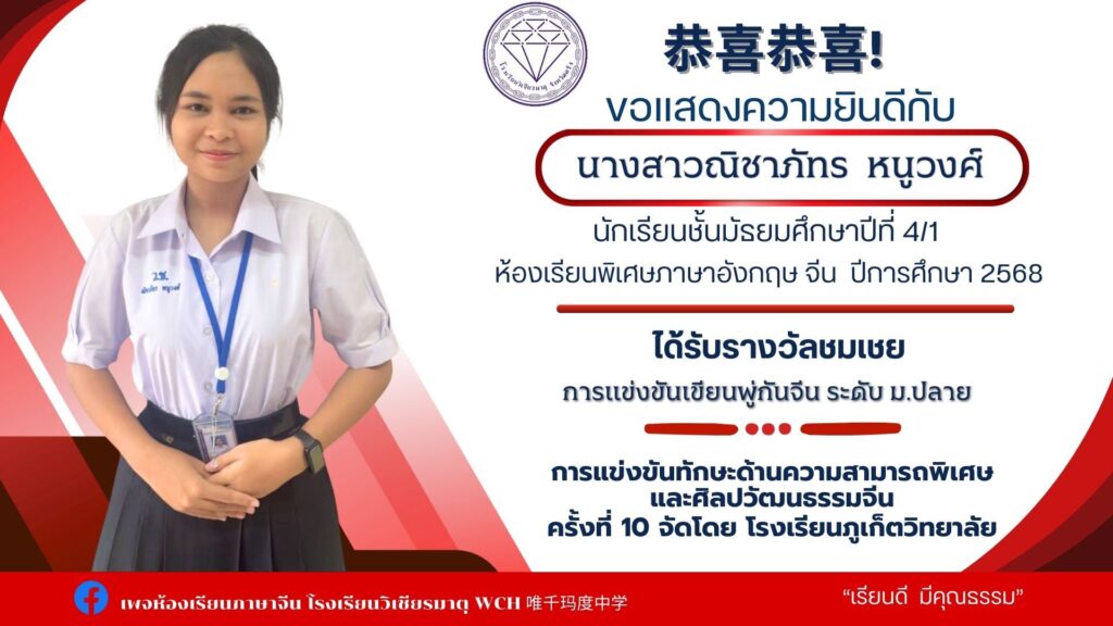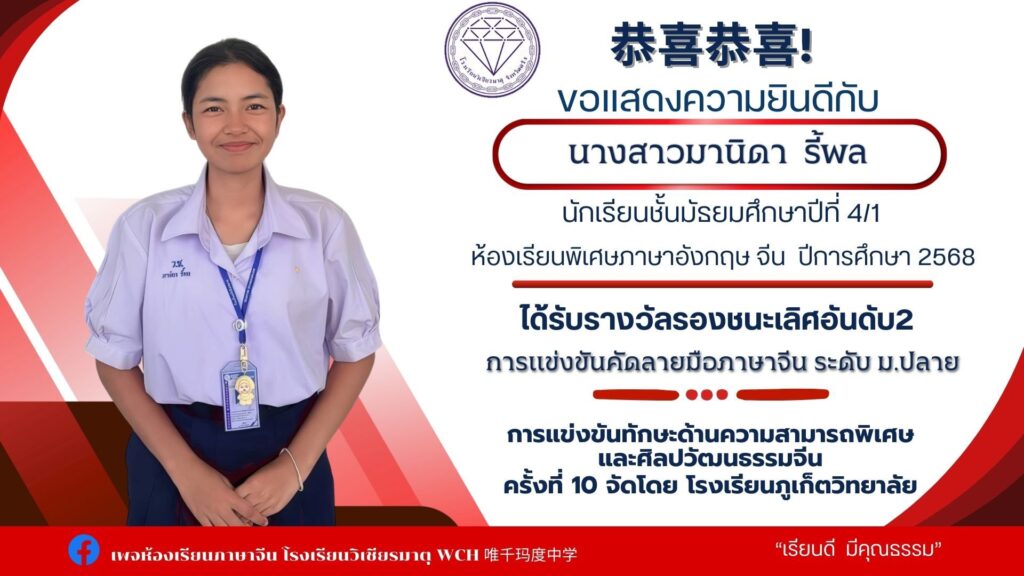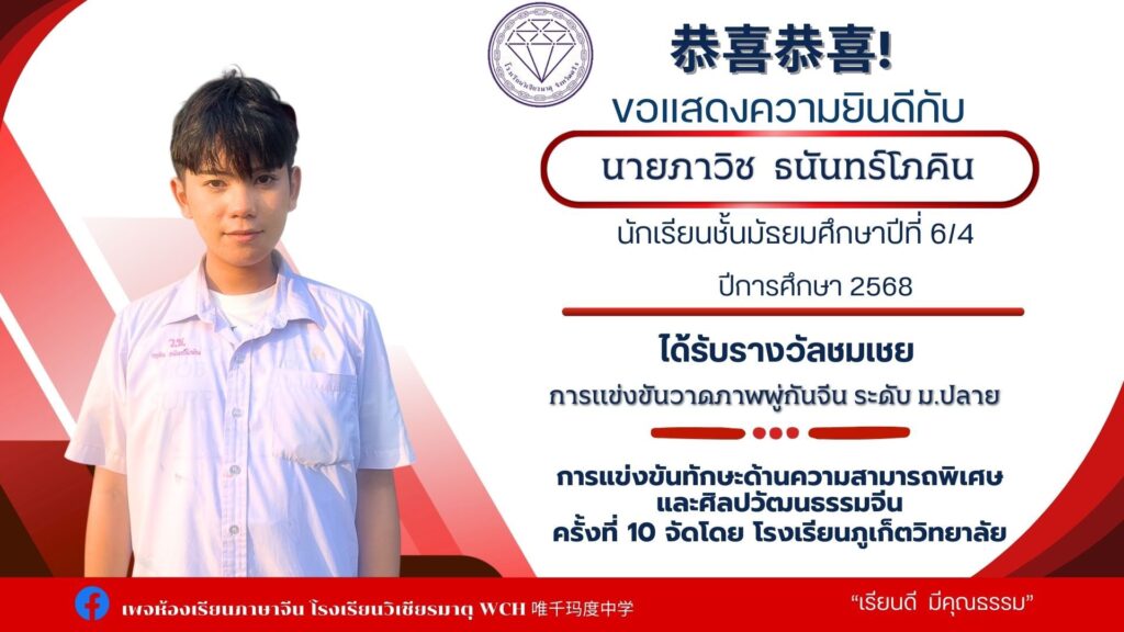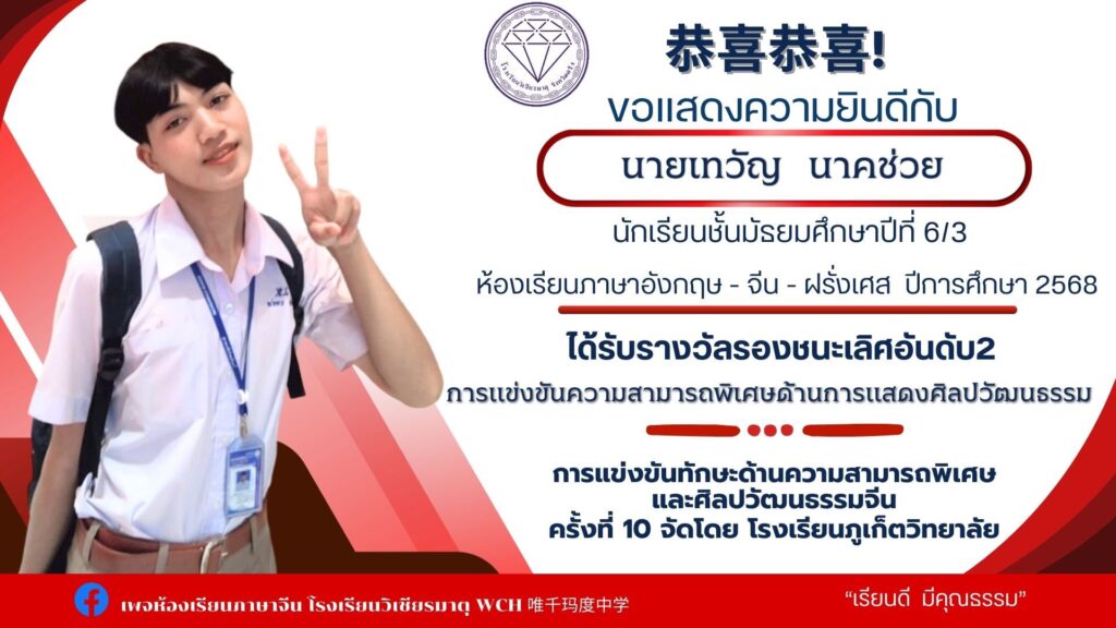 นายเทวัญ นาคช่วย ม.6/3 ได้รับรางวัลรองชนะเลิศอันดับ2 การแข่งขันความสามารถพิเศษด้านการแสดงศิลปวัฒนธรรมจีน เกียรติบัตรและเงินรางวัล500 บาท