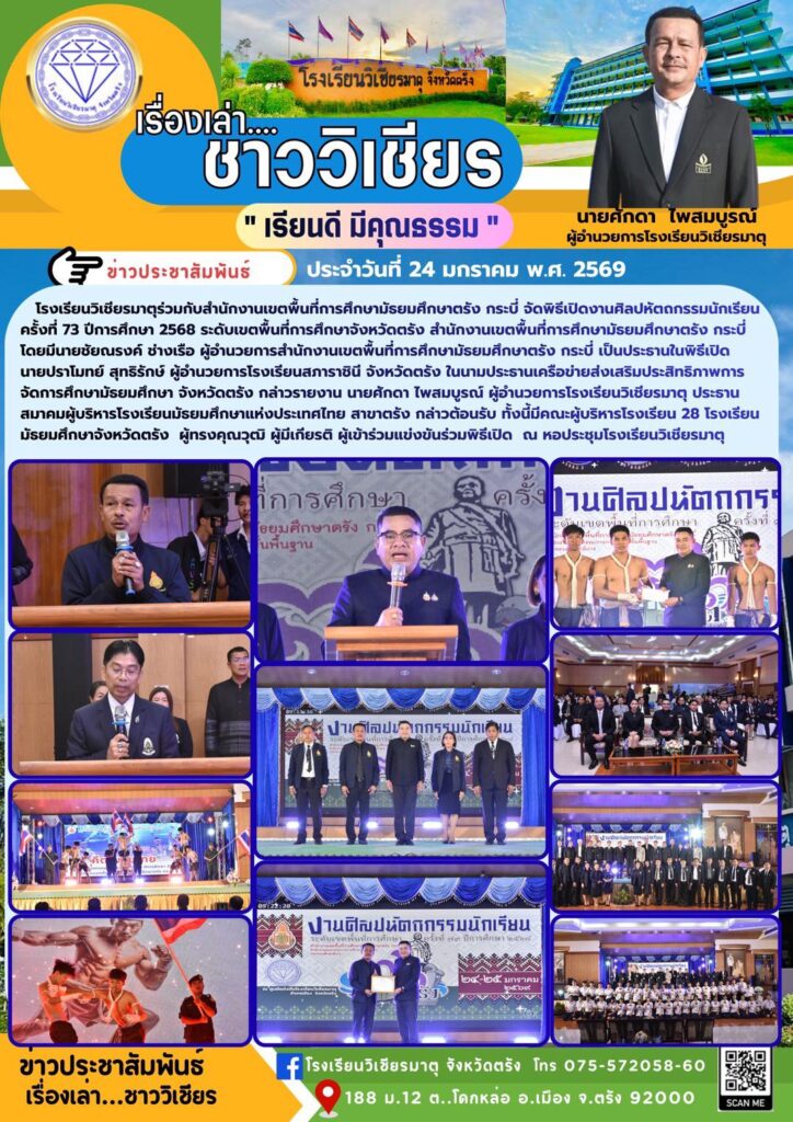 โรงเรียนวิเชียรมาตุร่วมกับสำนักงานเขตพื้นที่การศึกษามัธยมศึกษาตรัง กระบี่ จัดพิธีเปิดงานศิลปหัตถกรรมนักเรียนครั้งที่ 73 ปีการศึกษา 2568 ระดับเขตพื้นที่การศึกษาจังหวัดตรัง สำนักงานเขตพื้นที่การศึกษามัธยมศึกษาตรัง กระบี่ โดยมีนายชัยณรงค์ ช่างเรือ ผู้อำนวยการสำนักงานเขตพื้นที่การศึกษามัธยมศึกษาตรัง กระบี่ เป็นประธานในพิธีเปิด นายปราโมทย์ สุทธิรักษ์ ผู้อำนวยการโรงเรียนสภาราชินี จังหวัดตรัง ในนามประธานเครือข่ายส่งเสริมประสิทธิภาพการจัดการศึกษามัธยมศึกษา จังหวัดตรัง กล่าวรายงาน นายศักดา ไพสมบูรณ์ ผู้อำนวยการโรงเรียนวิเชียรมาตุ ประธานสมาคมผู้บริหารโรงเรียนมัธยมศึกษาแห่งประเทศไทย สาขาตรัง กล่าวต้อนรับ ทั้งนี้มีคณะผู้บริหารโรงเรียน 28 โรงเรียนมัธยมศึกษาจังหวัดตรัง ผู้ทรงคุณวุฒิ ผู้มีเกียรติ ผู้เข้าร่วมแข่งขันร่วมพิธีเปิด ณ หอประชุมโรงเรียนวิเชียรมาตุ