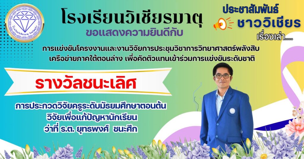 รางวัลชนะเลิศการประกวดวิจัยครูระดับมัธยมศึกษาตอนต้นวิจัยเพื่อแก้ปัญหานักเรียน February 9, 2026February 9, 2026 admin รางวัลชนะเลิศการประกวดวิจัยครูระดับมัธยมศึกษาตอนต้นวิจัยเพื่อแก้ปัญหานักเรียนว่าที่ ร.ต. ยุทธพงศ์ ชนะศึก
