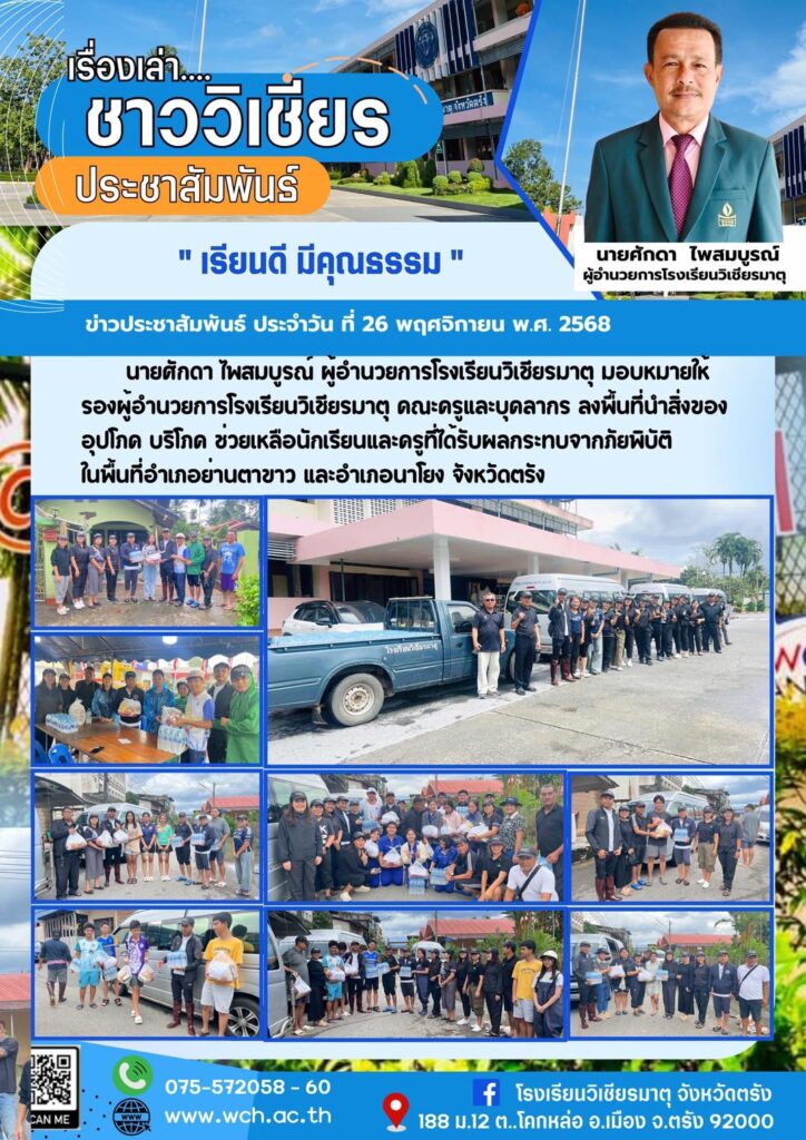 นายศักดา ไพสมบูรณ์ ผู้อำนวยการโรงเรียนวิเชียรมาตุ มอบหมายให้ รองผู้อำนวยการโรงเรียนวิเชียรมาตุ คณะครูและบุคลากร ลงพื้นที่นำสิ่งของอุปโภค บริโภค ช่วยเหลือนักเรียนและครูที่ได้รับผลกระทบจากภัยพิบัติ ในพื้นที่อำเภอย่านตาขาว และอำเภอนาโยง จังหวัดตรัง