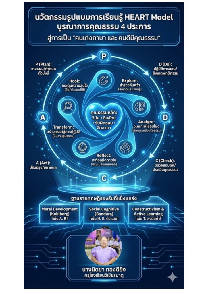 นวัตกรรมรูปแบบการเรียนรู้ HEART Model บูรณาการคุณธรรม 4 ประการ สู่การเป็น “คนเก่งภาษาและคนดีมีคุณธรรม” February 12, 2026February 12, 2026 admin นวัตกรรมรูปแบบการเรียนรู้ HEART Model บูรณาการคุณธรรม 4 ประการ สู่การเป็น “คนเก่งภาษาและคนดีมีคุณธรรม”เผยแพร่โดย..นางนิตยา ทองดียิ่ง ตำแหน่ง ครู วิทยฐานะ ครูชำนาญการพิเศษ กลุ่มสาระการเรียนรู้ภาษาไทย